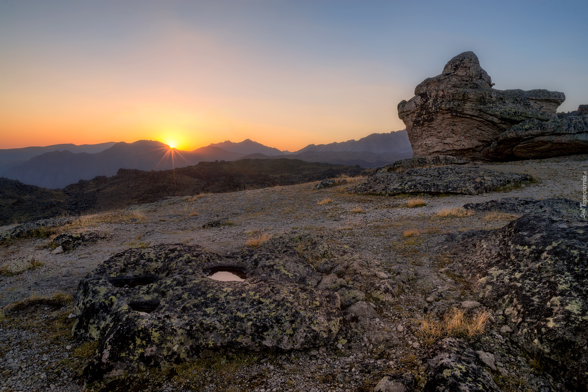 Edytor tapety: Skały na wzgórzu w zachodzącym słońcu