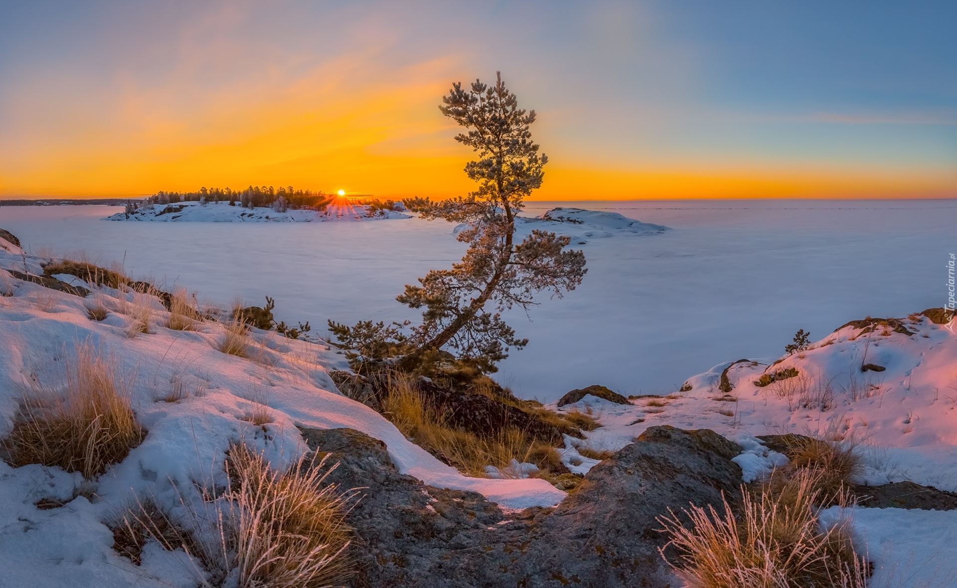 Edytor tapety: Wykrzywiona sosenka na brzegu zaśnieżonego jeziora Ładoga