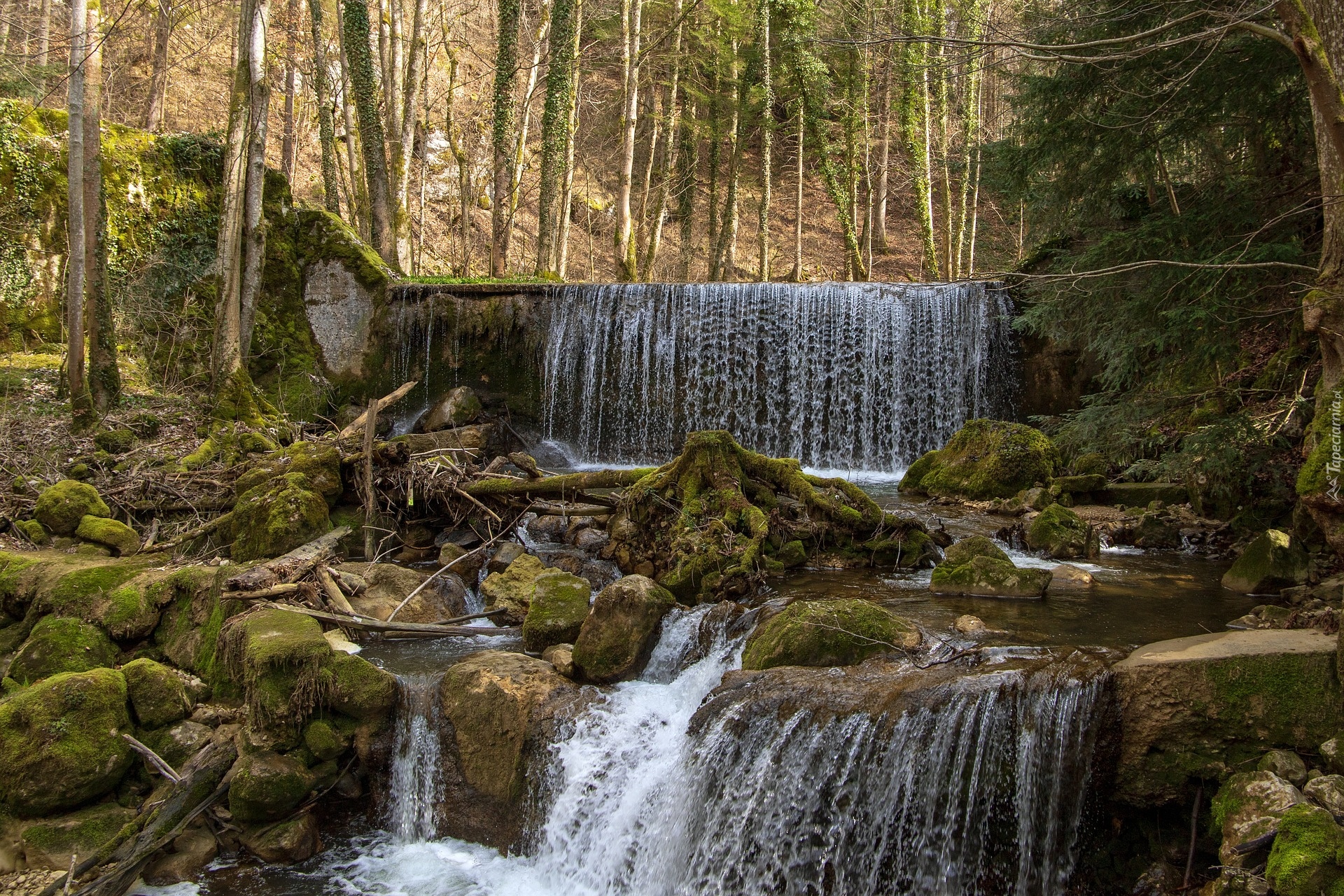 Edytor tapety: Omszałe kamienie w lesie na tle wodospadu