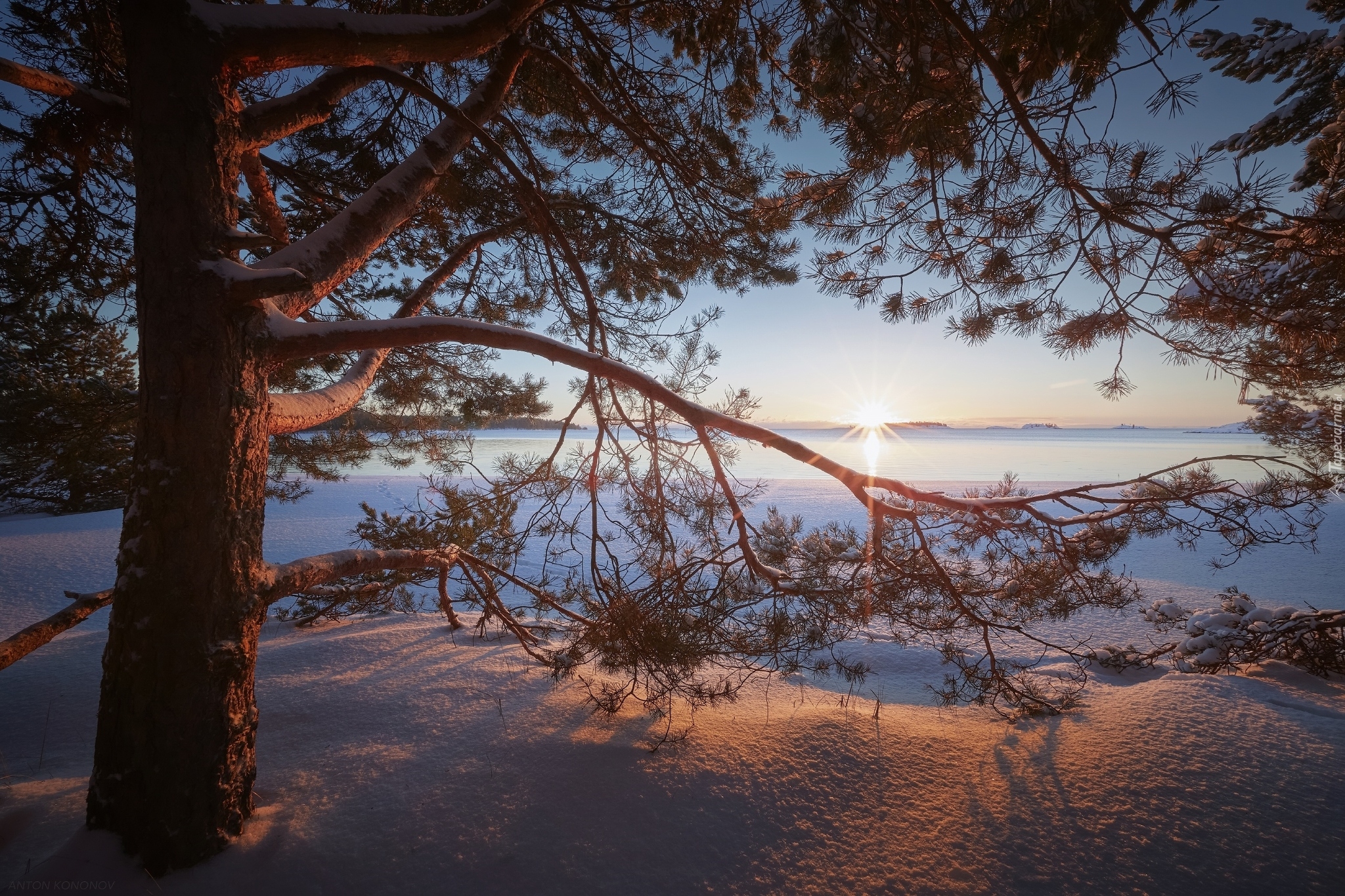 Edytor tapety: Sosna w zimowej szacie nad jeziorem Ładoga
