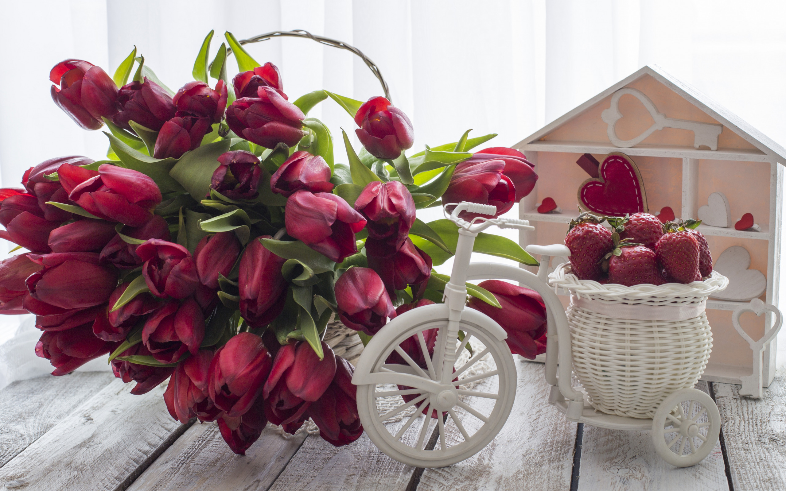 Edytor tapety: Dekoracyjny rowerek z truskawkami obok bukietu tulipanów