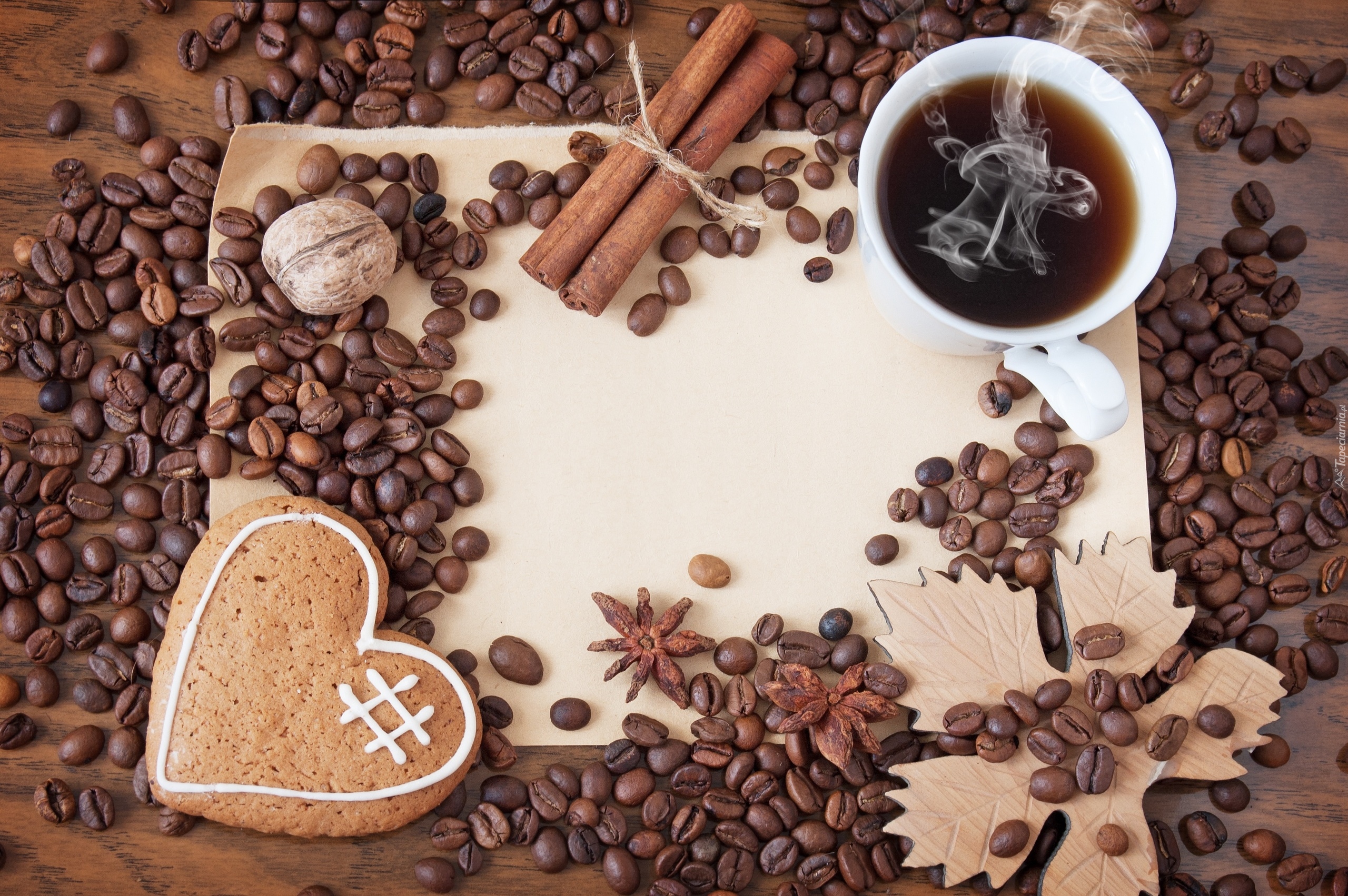 Edytor tapety: Filiżanka kawy i pierniczek na rozsypanych ziarnach