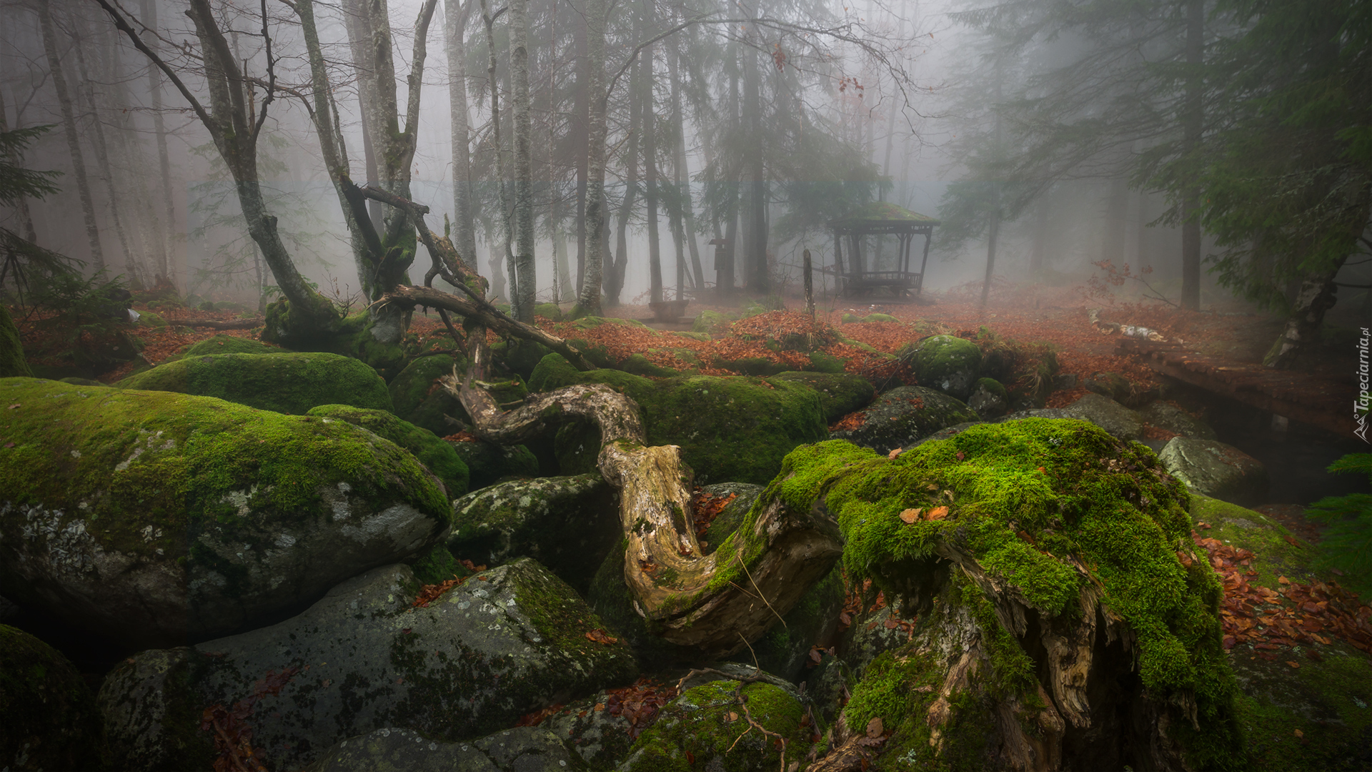 Edytor tapety: Omszałe pnie i kamienie w zamglonym lesie