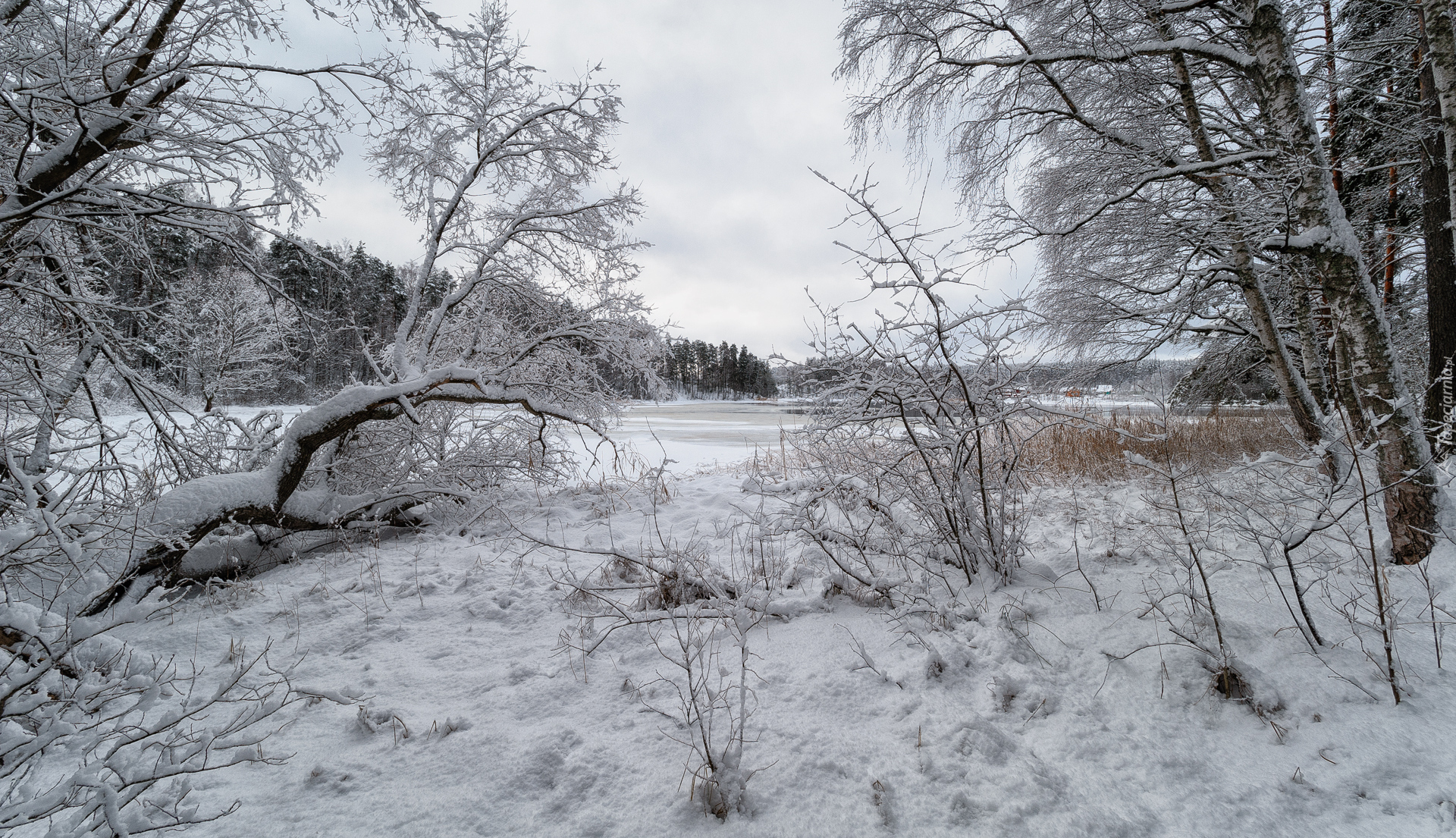 Edytor tapety: Roślinność w śniegu nad rzeką