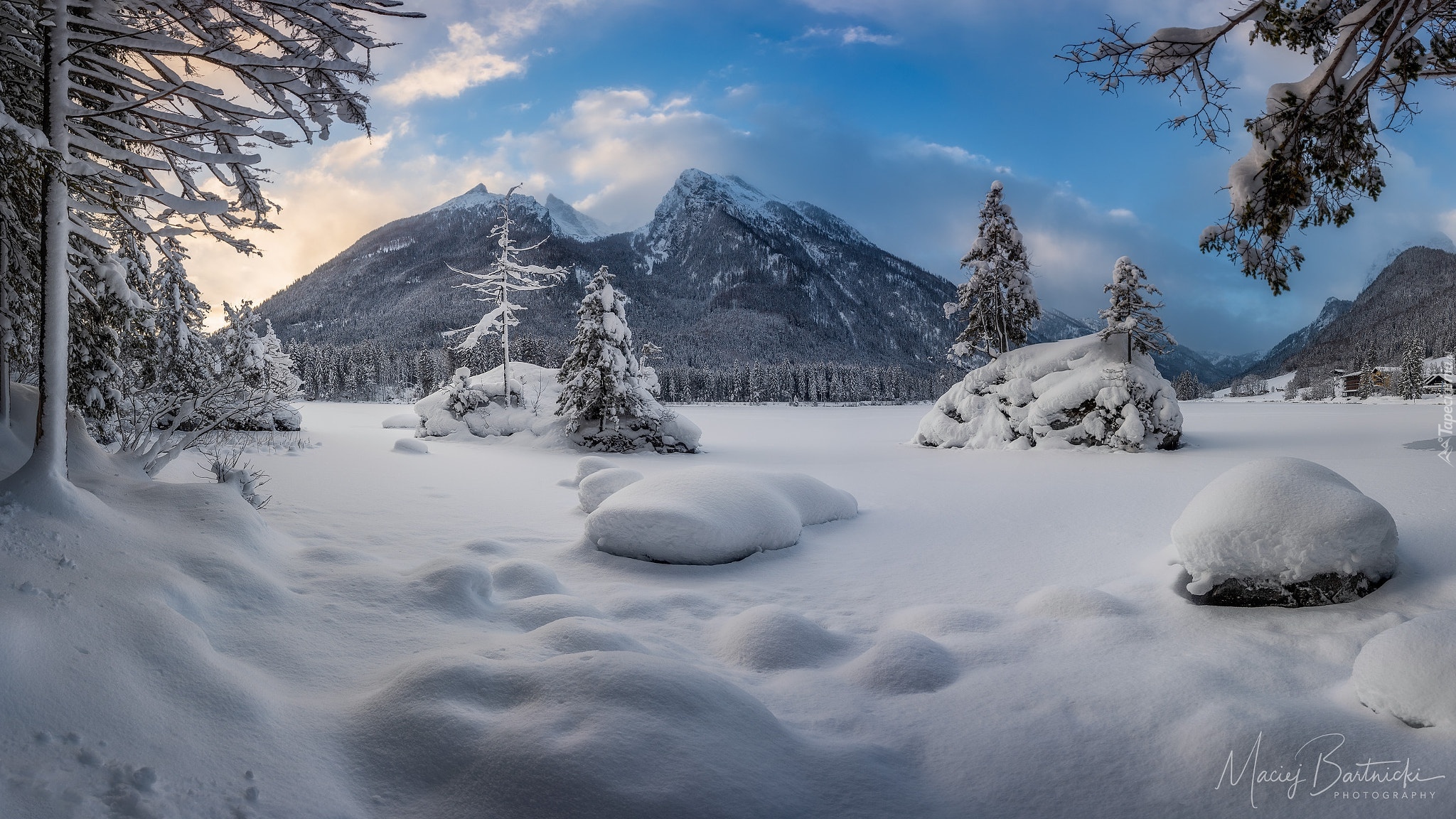 Edytor tapety: Zaśnieżone jezioro Hintersee na tle gór