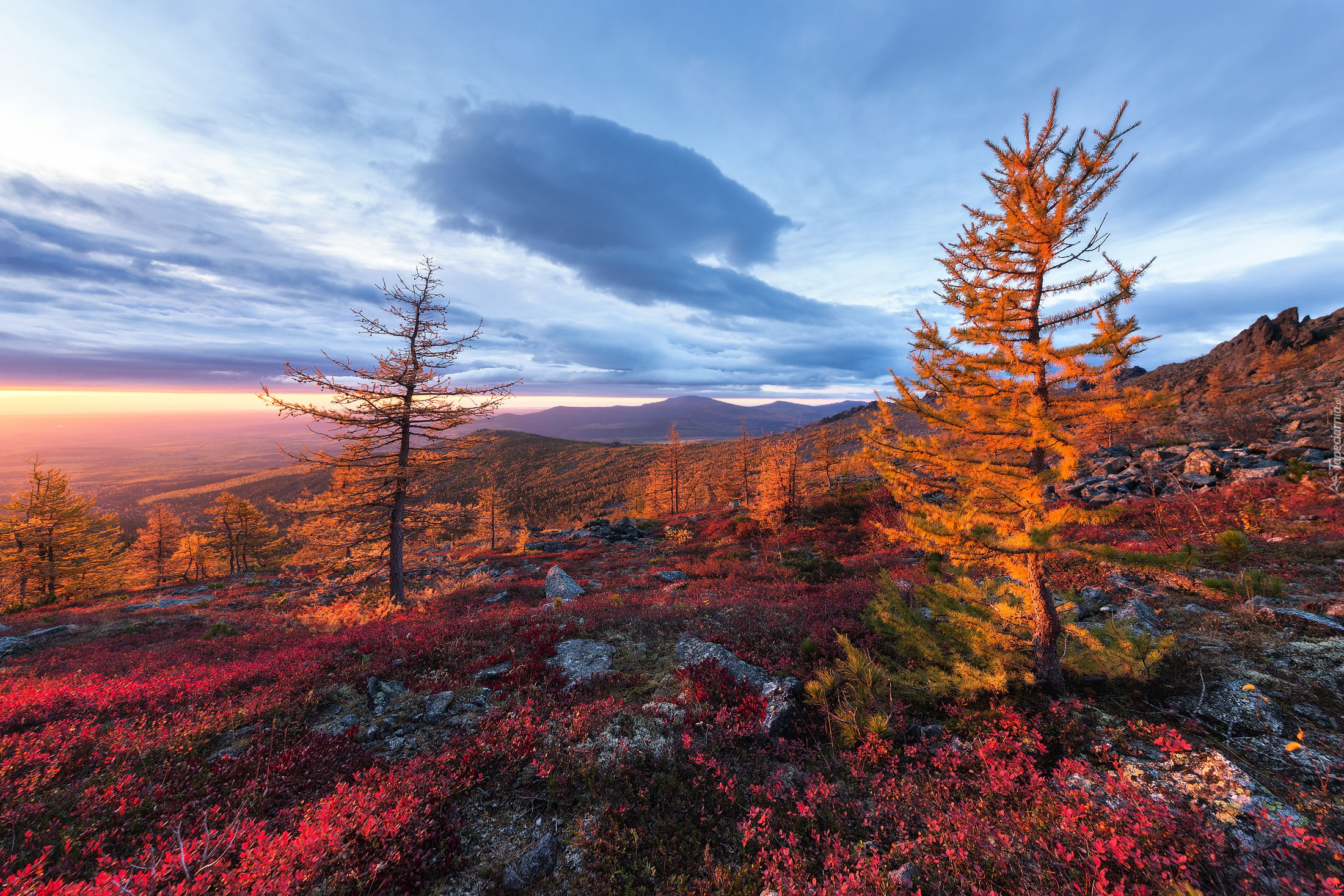 Edytor tapety: Jesienny krajobraz z drzewami na tle gór