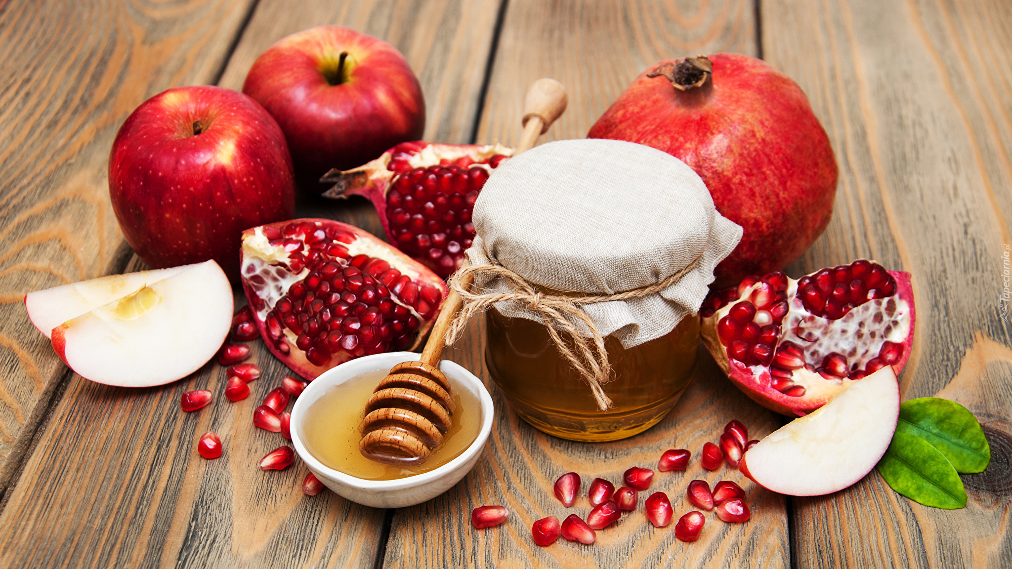 Edytor tapety: Jabłka i granaty wokół słoika z miodem