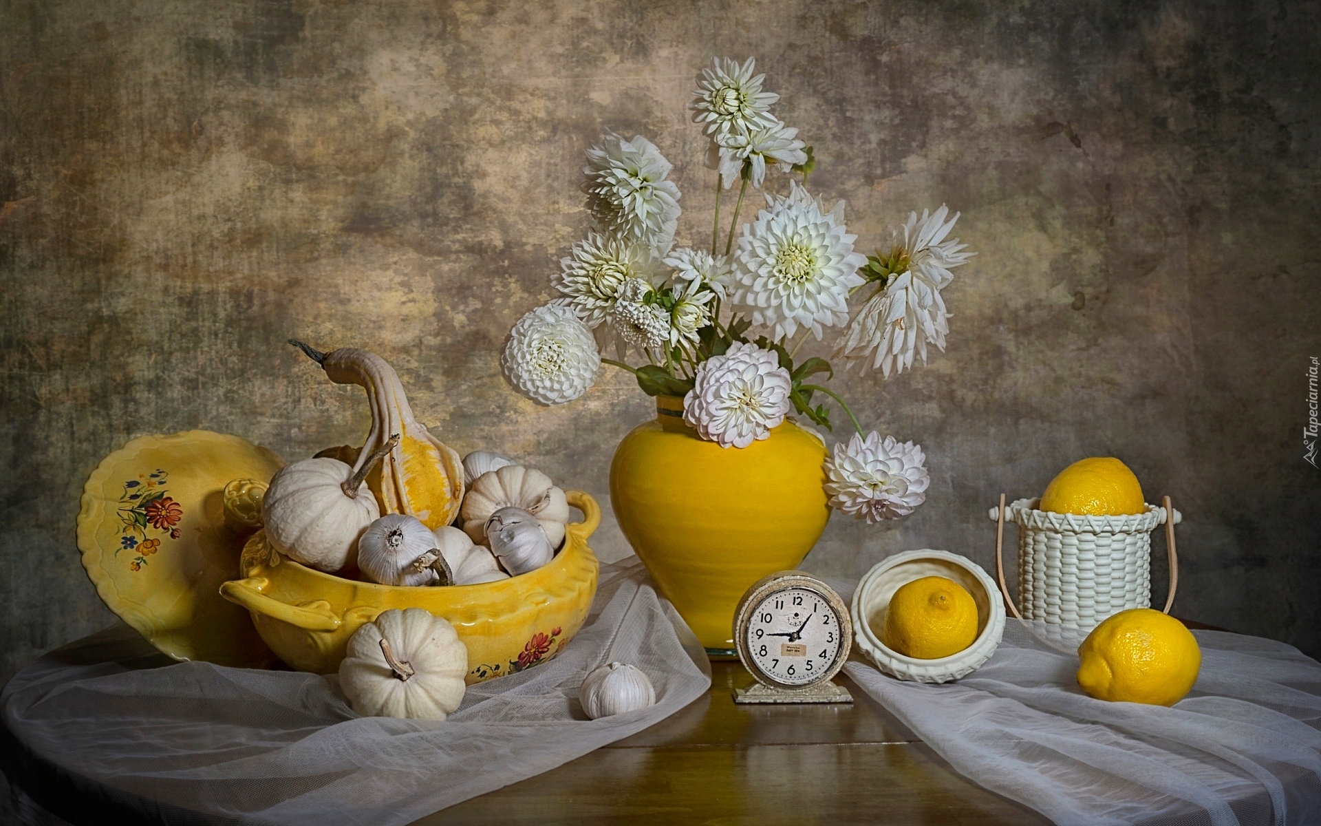 Edytor tapety: Czosnek i cytryny obok wazonu z daliami