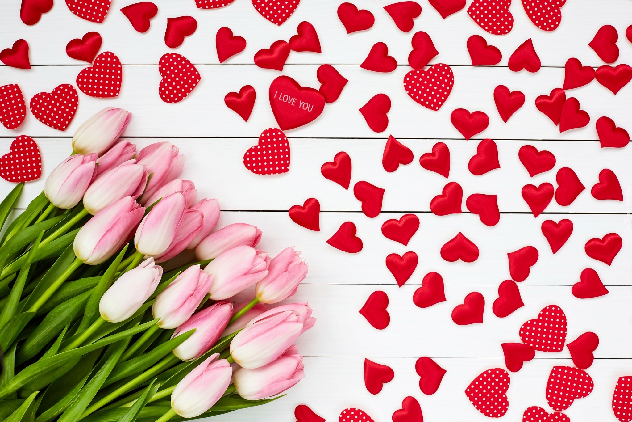 Edytor tapety: Serduszka ułożone obok bukietu tulipanów