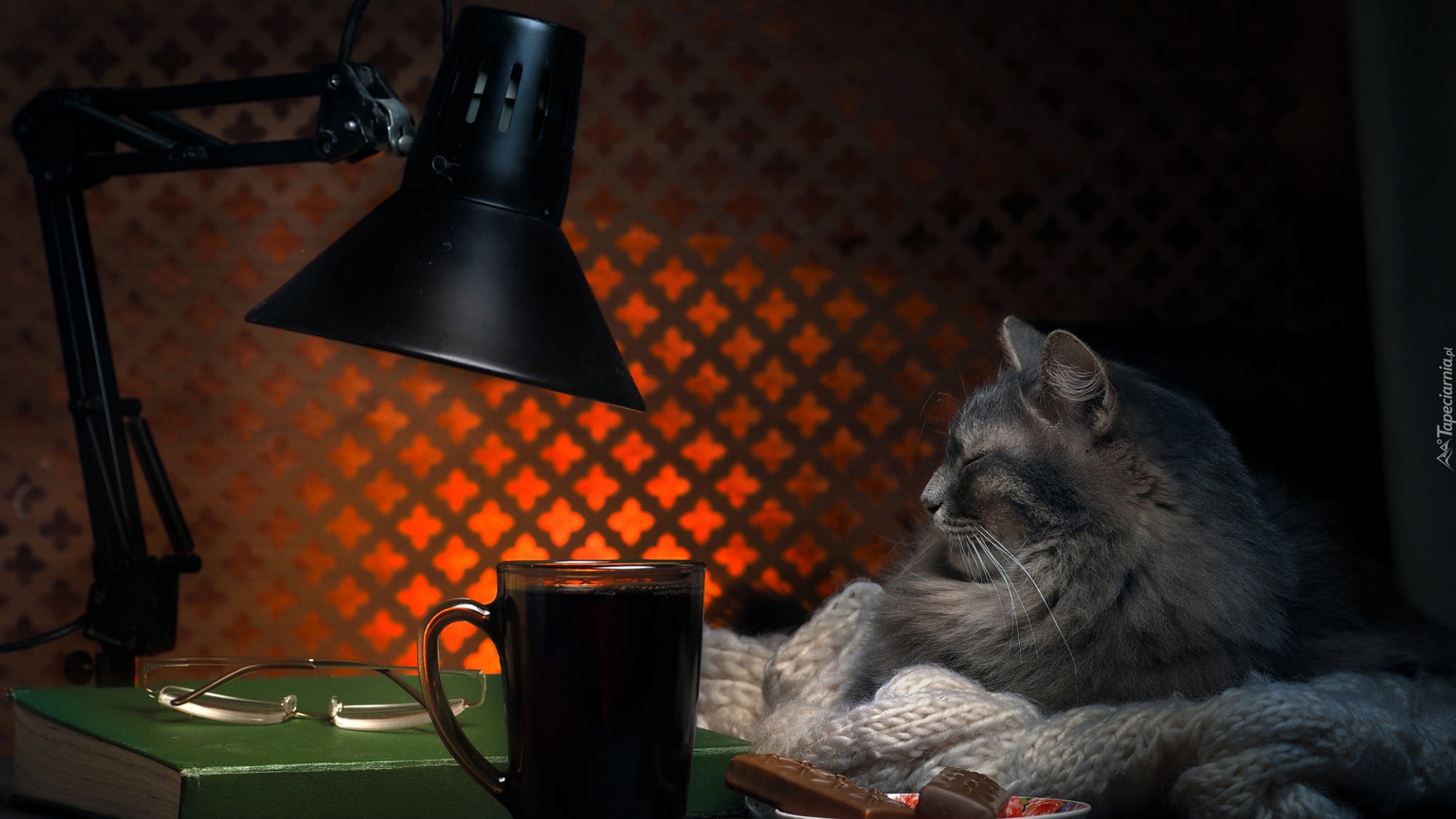 Edytor tapety: Kot leżący obok lampy i książki