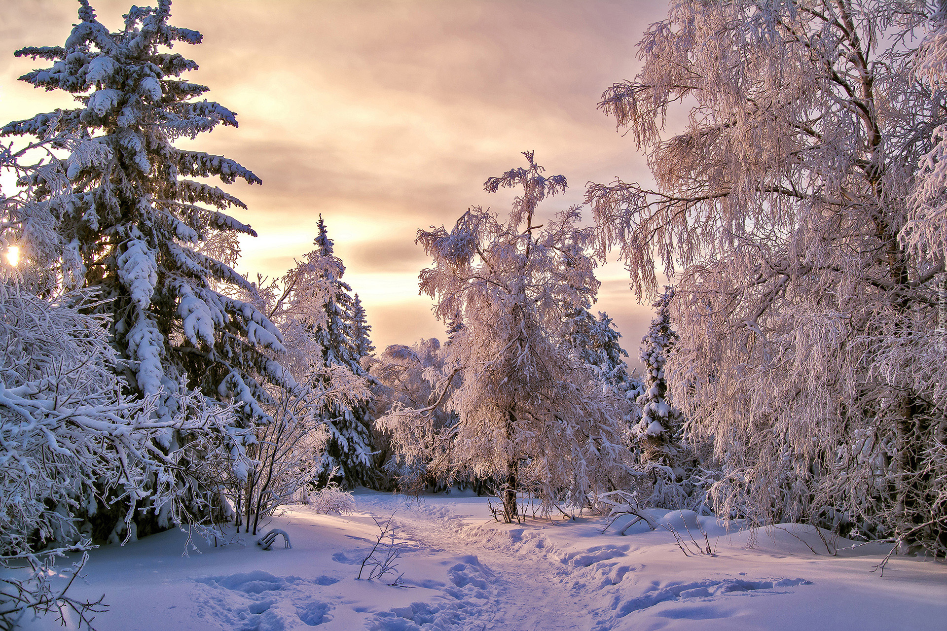 Edytor tapety: Dróżka wydeptana w śniegu pośród ośnieżonych drzew
