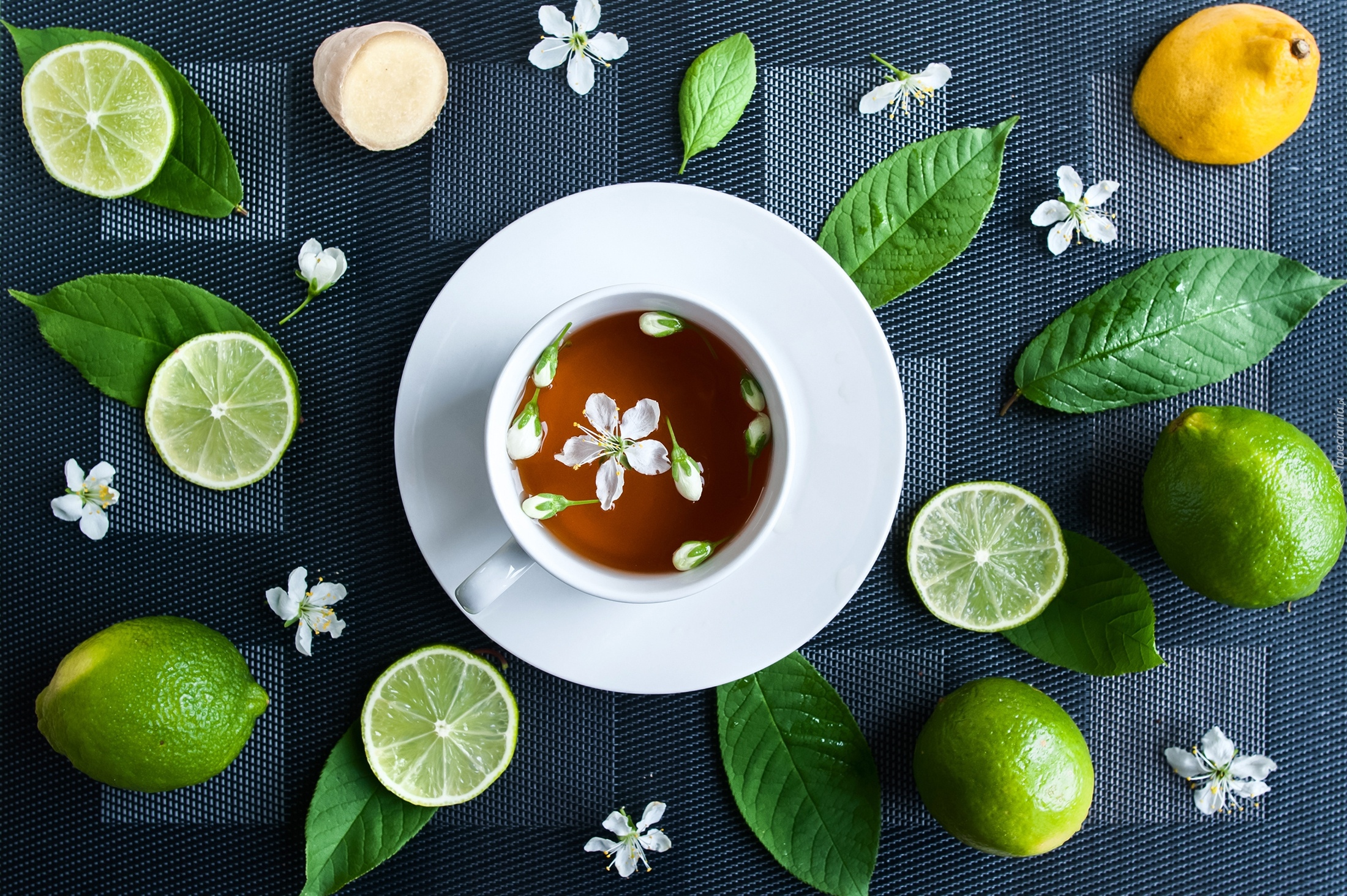 Edytor tapety: Limonki dookoła filiżanki z herbatą