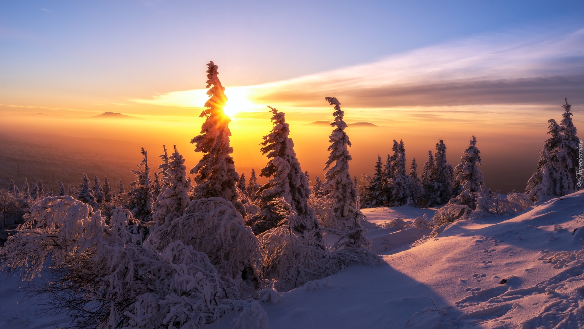 Edytor tapety: Ośnieżone świerki w promieniach wschodzącego słońca