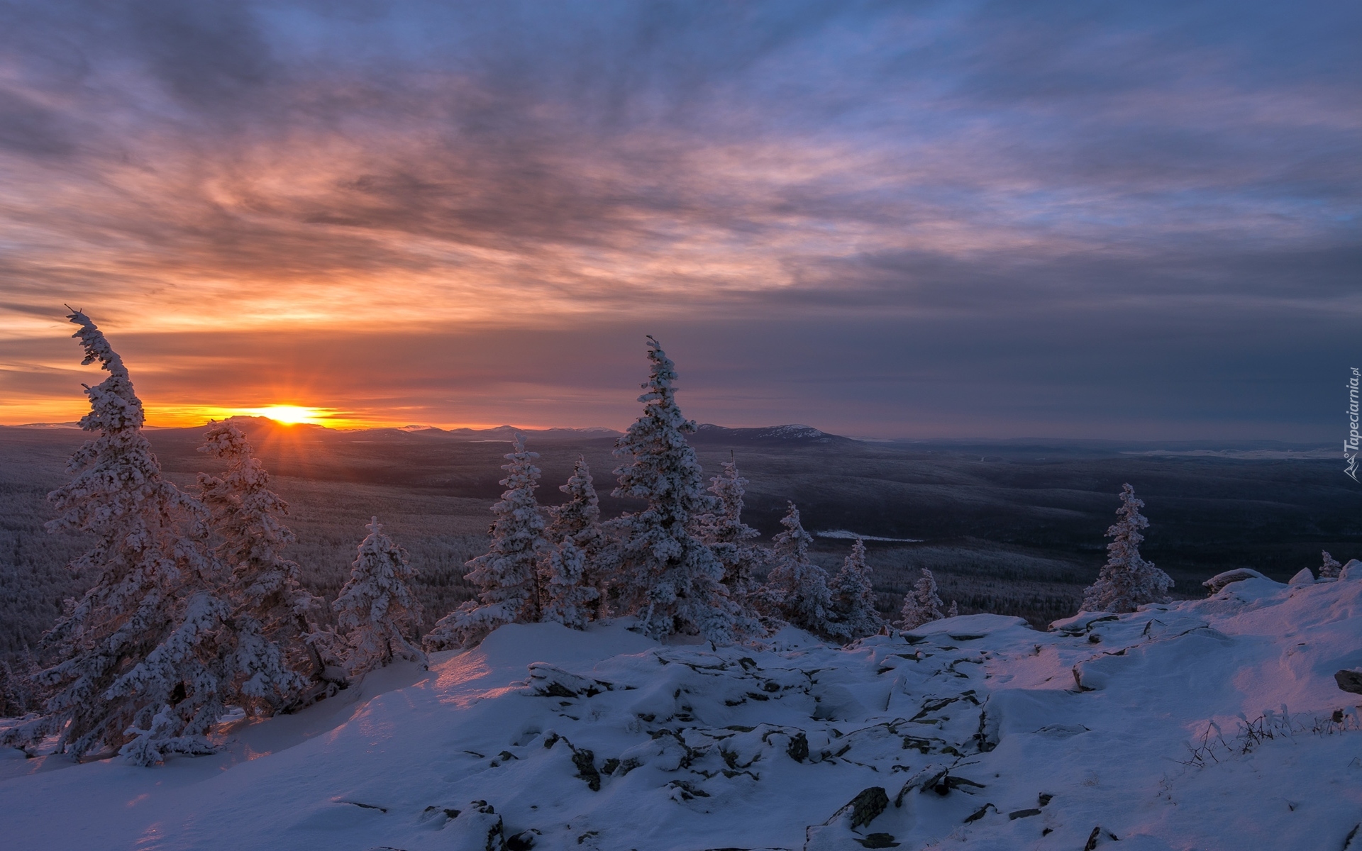 Edytor tapety: Ośnieżone drzewa rozświetlone zachodzącym słońcem