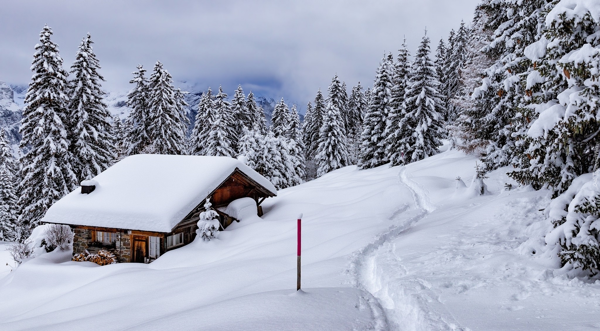 Edytor tapety: Ośnieżone świerki obok domu na wzgórzu