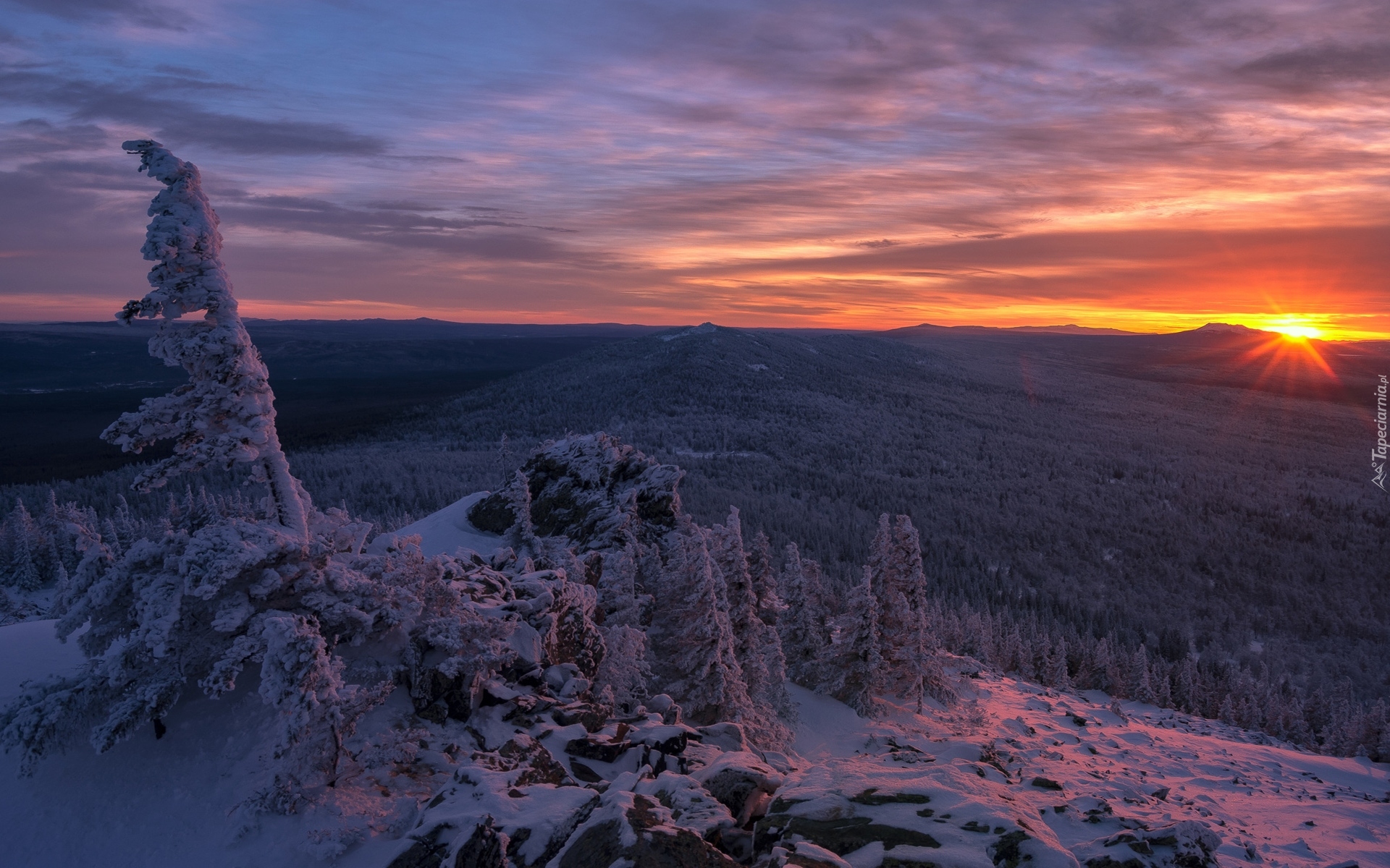 Edytor tapety: Zalesione wzgórza o zachodzie słońca