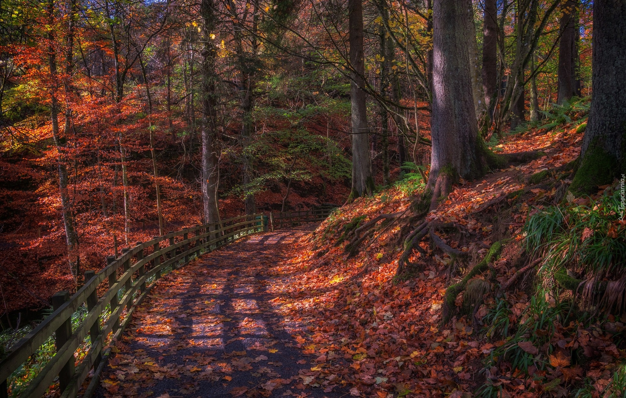 Edytor tapety: Przebijające światło na jesiennej drodze w lesie
