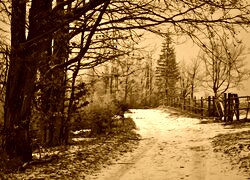 Edytor tapety: Ogrodzenie wzdłuż drogi pośród drzew