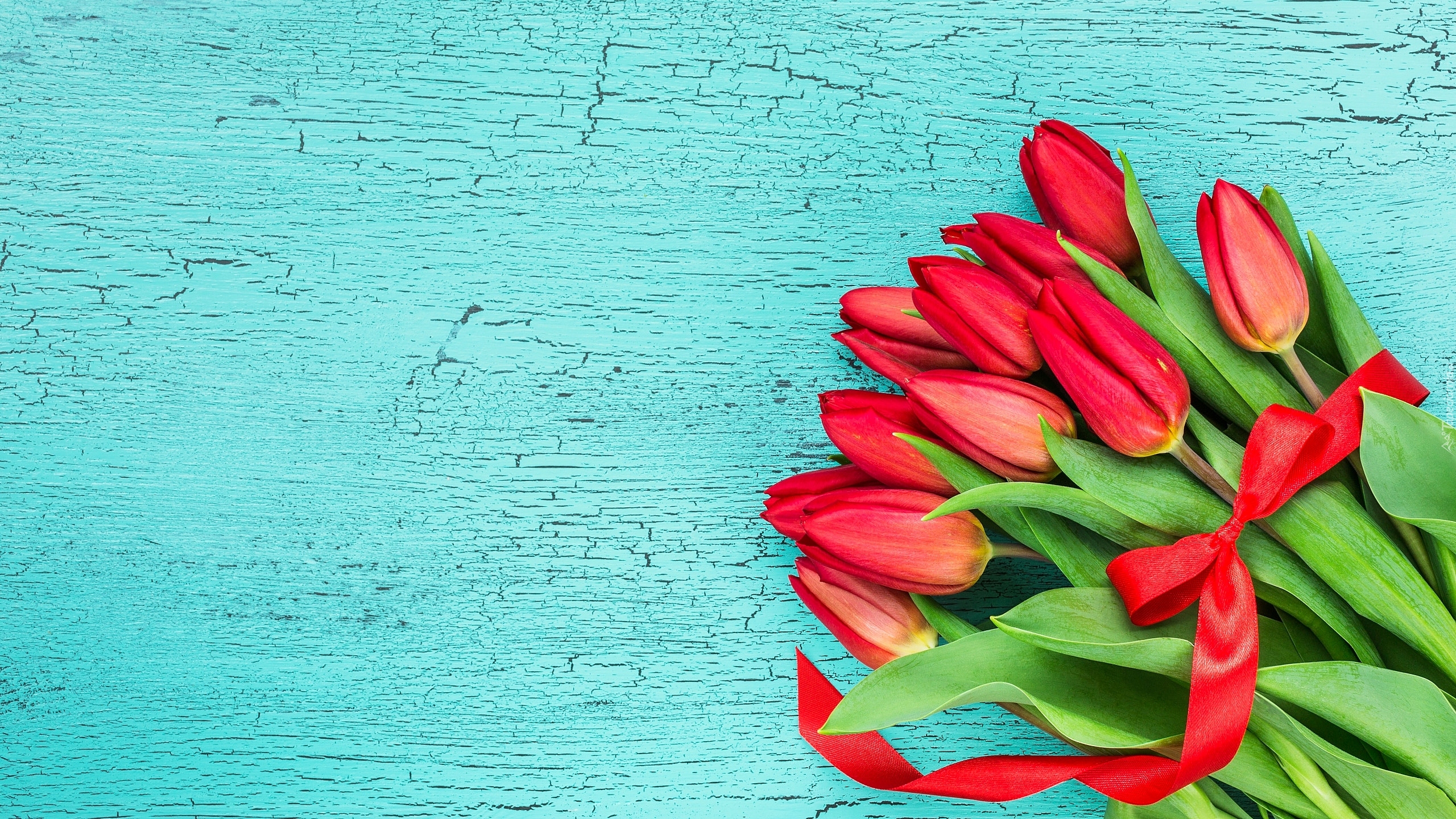 Edytor tapety: Bukiet czerwonych tulipanów udekorowany wstążką