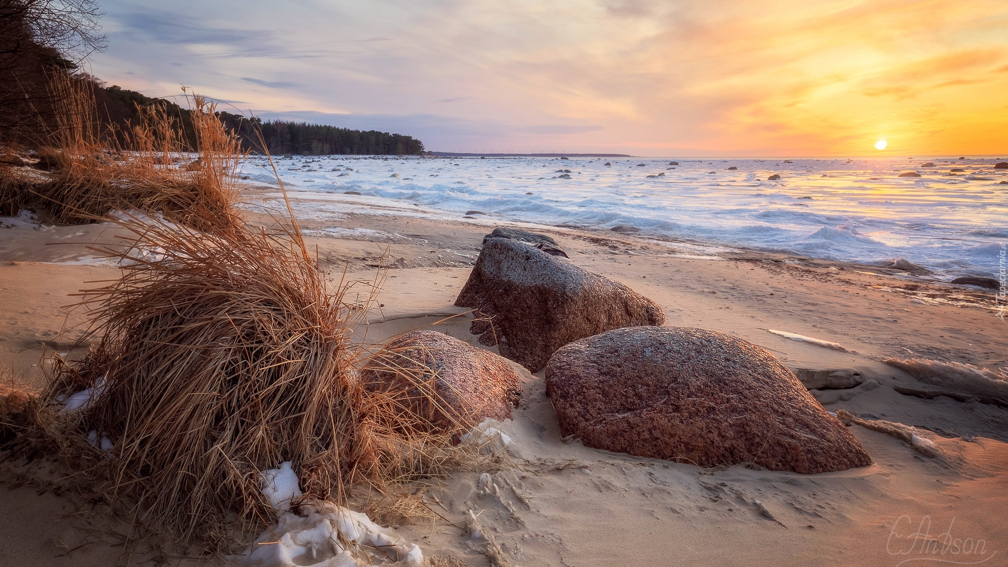 Edytor tapety: Uschnięta trawa i kamienie na plaży