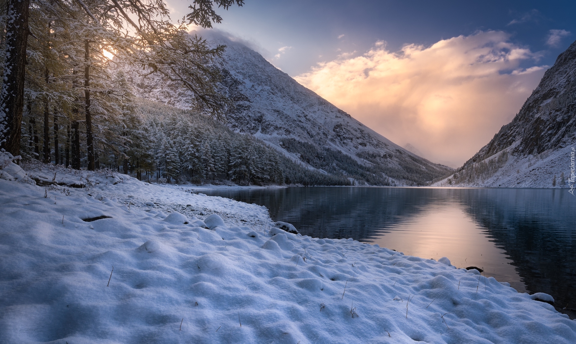 Edytor tapety: Zimowy poranek w górach nad jeziorem