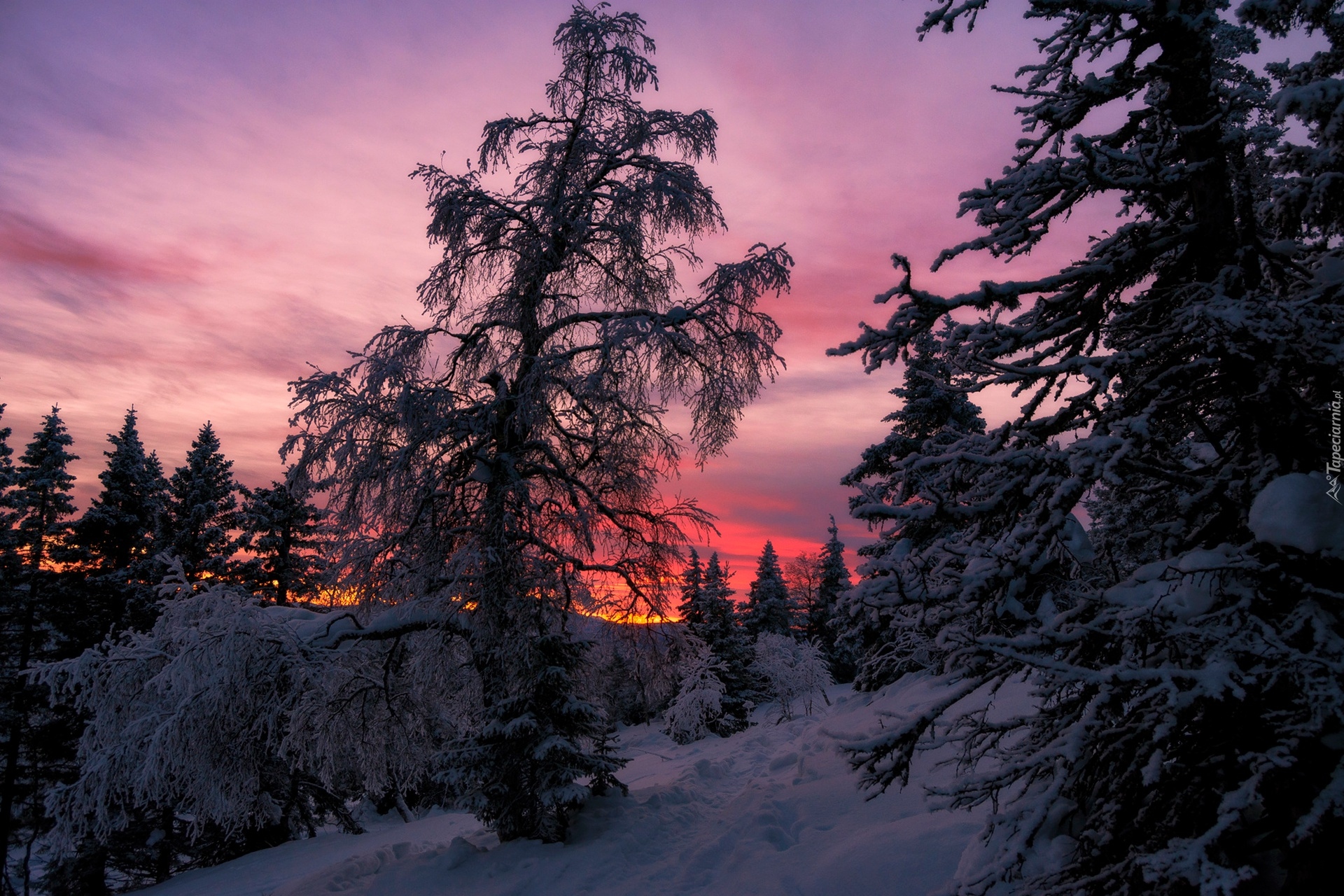 Edytor tapety: Słońce zachodzi za ośnieżony las