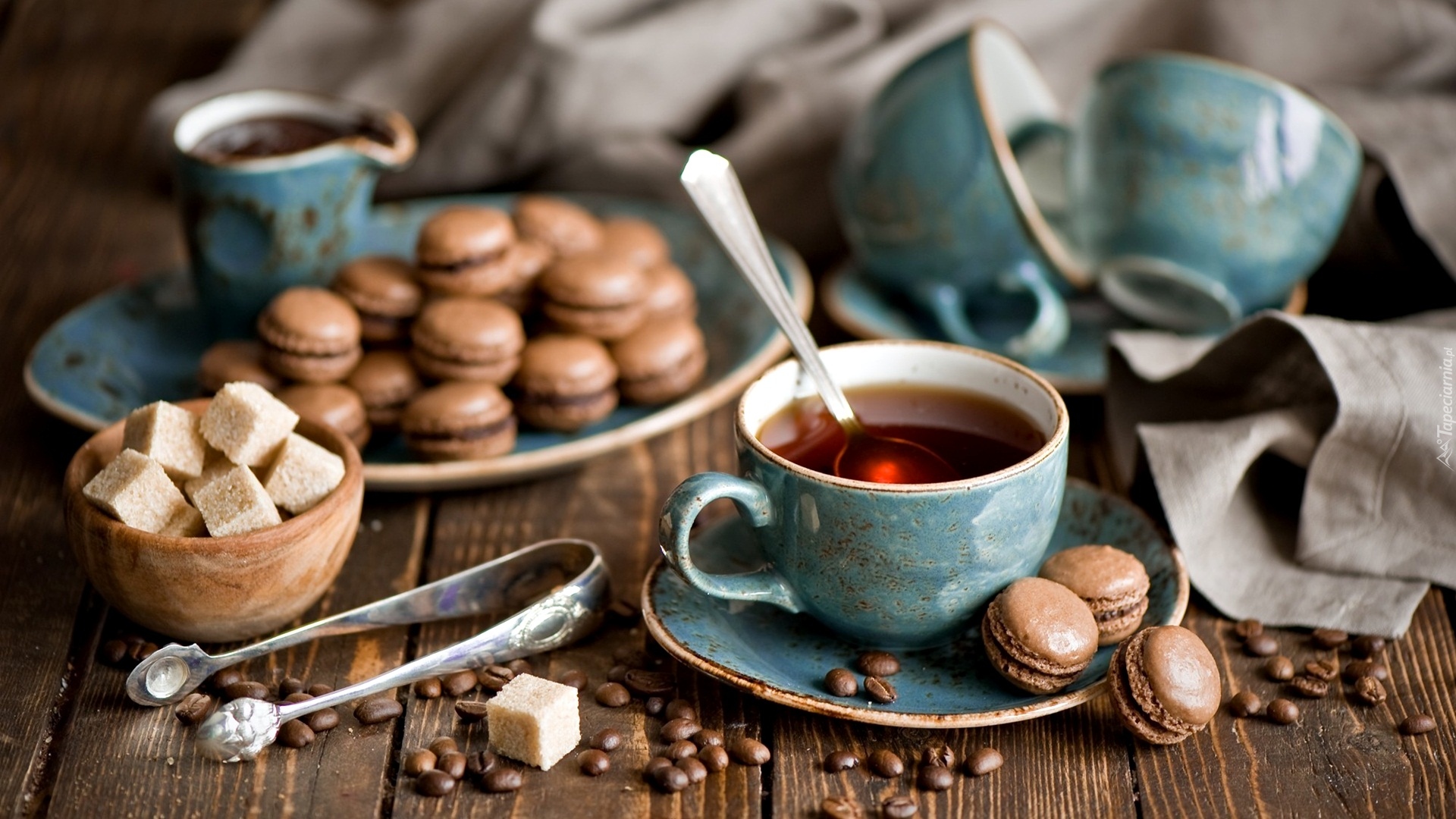 Edytor tapety: Cukier w kostkach i makaroniki obok filiżanki herbaty