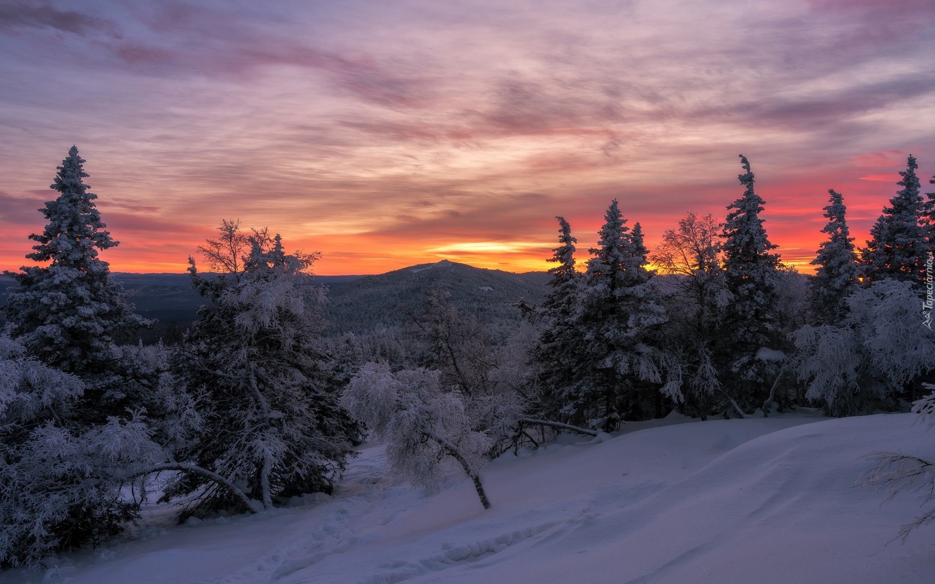 Edytor tapety: Zimowy krajobraz zalesionego wzgórza