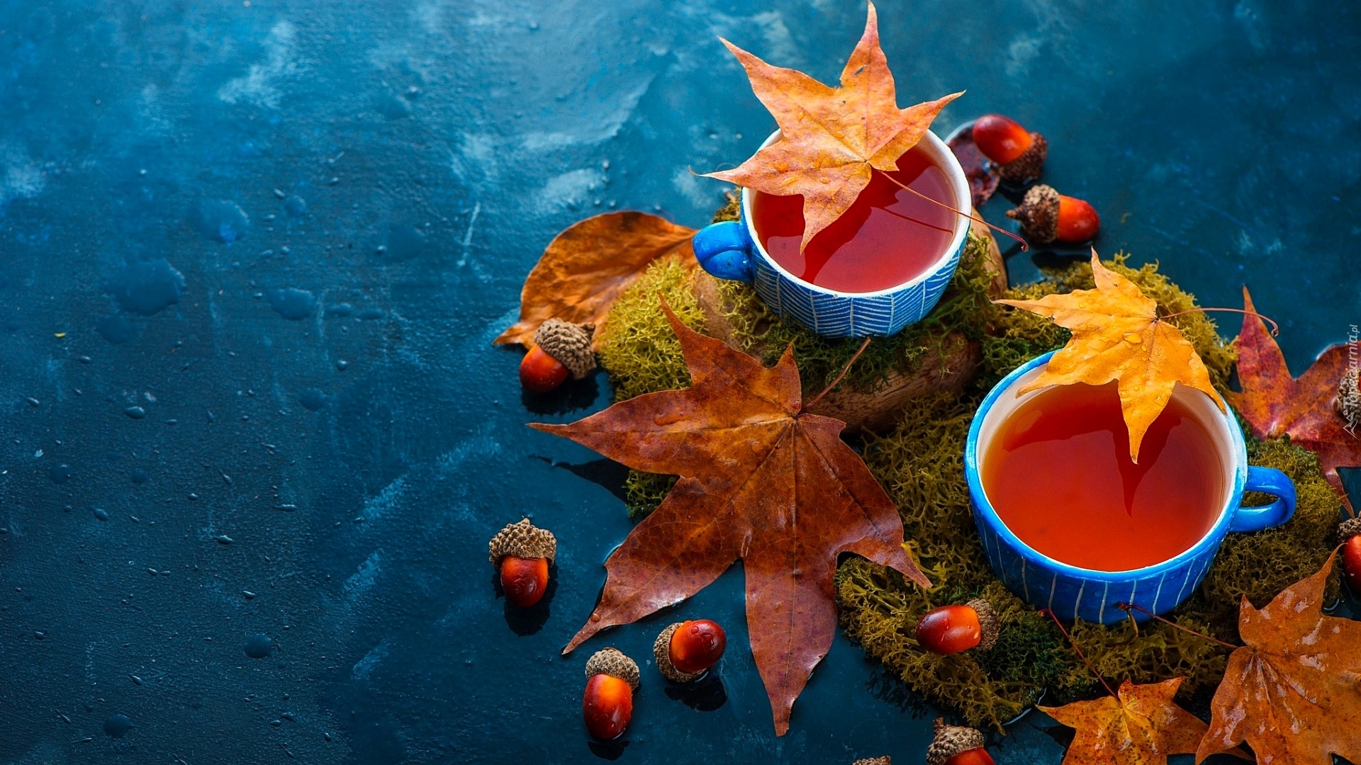 Edytor tapety: Herbata w niebieskich filiżankach wśród liści