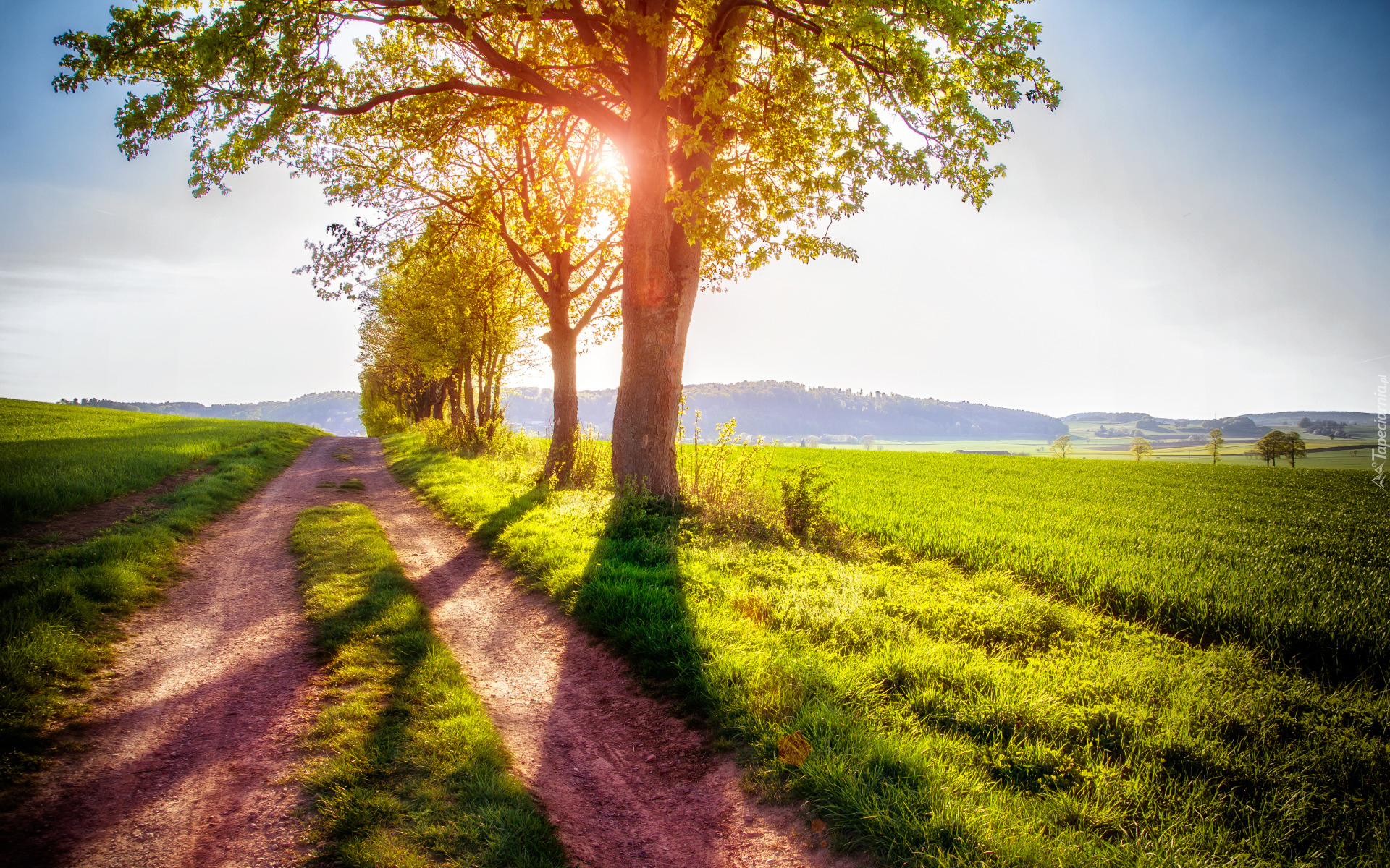 Edytor tapety: Drzewa przy drodze w słońcu