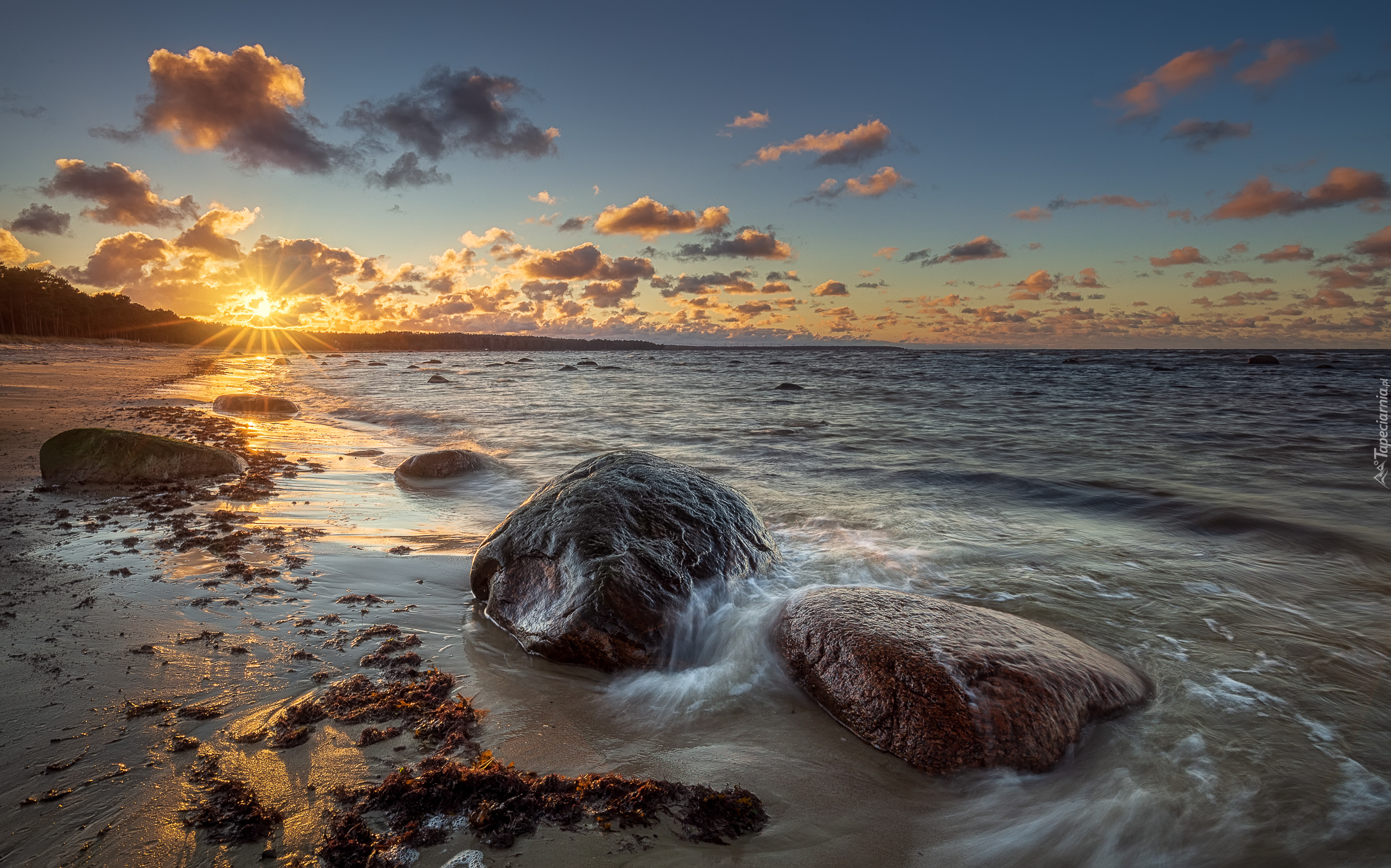 Edytor tapety: Kamienie na plaży w promieniach zachodzącego słońca