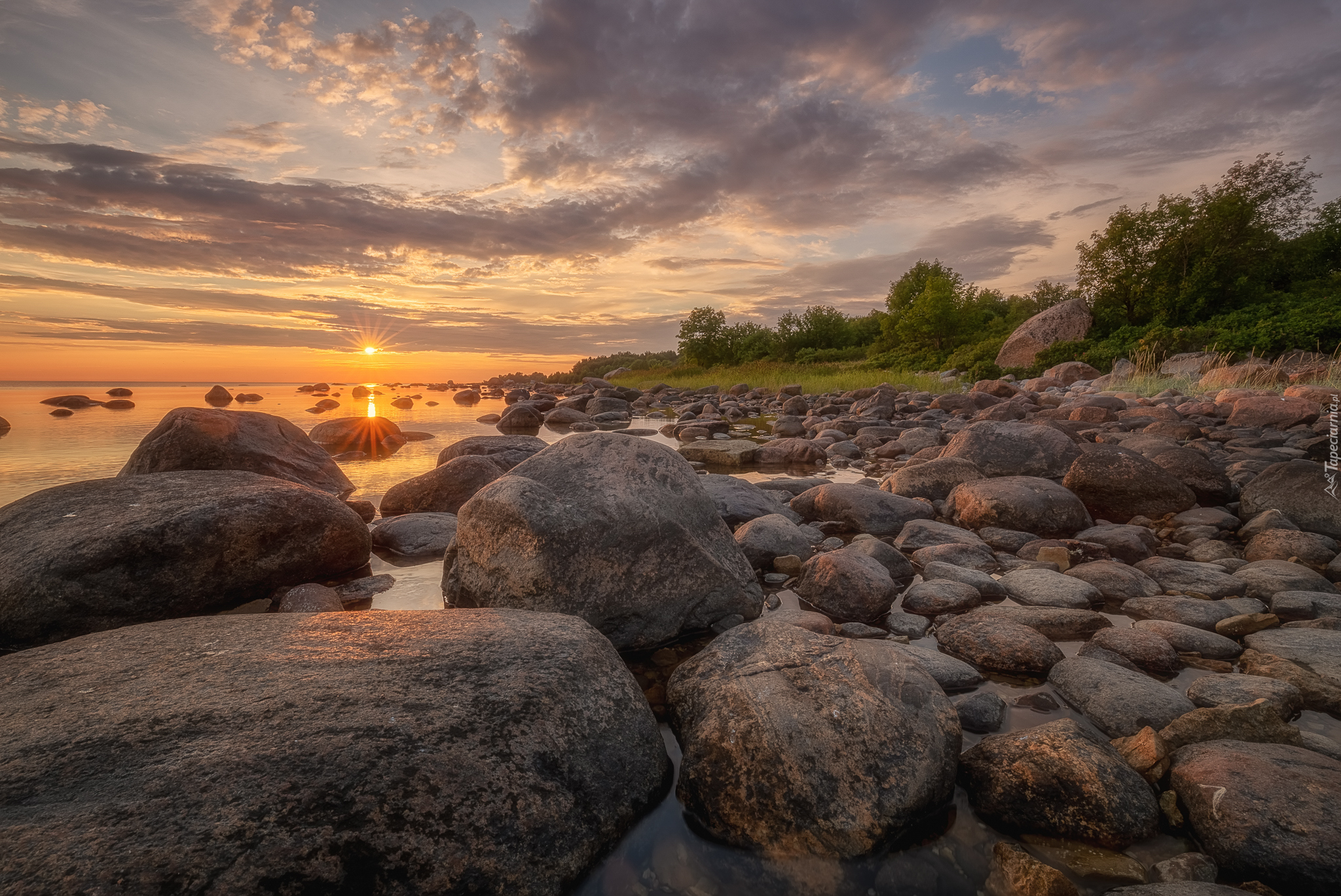Edytor tapety: Kamienie i drzewa na brzegu morza