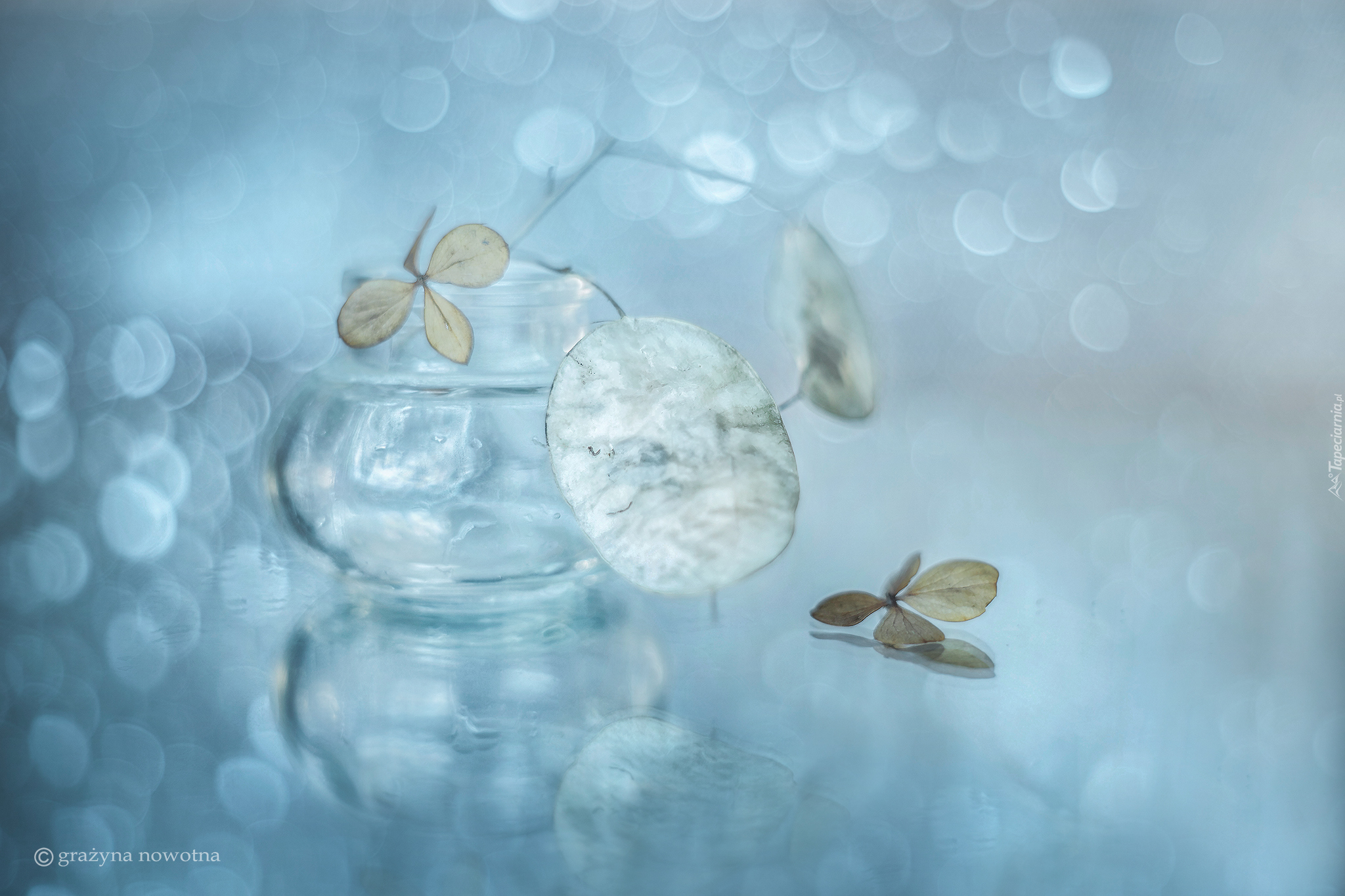Edytor tapety: Uschnięta miesiącznica i hortensja w szklanym wazoniku