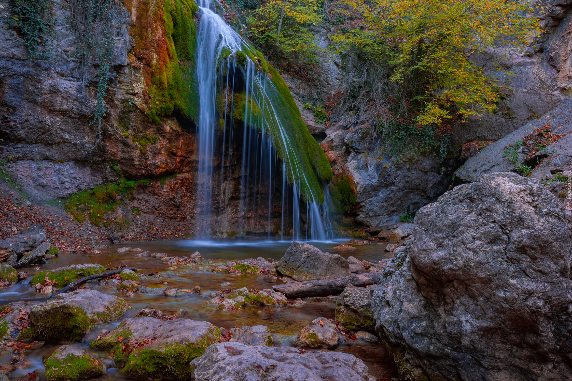 Edytor tapety: Woda z wodospadu spływająca po omszałej skale