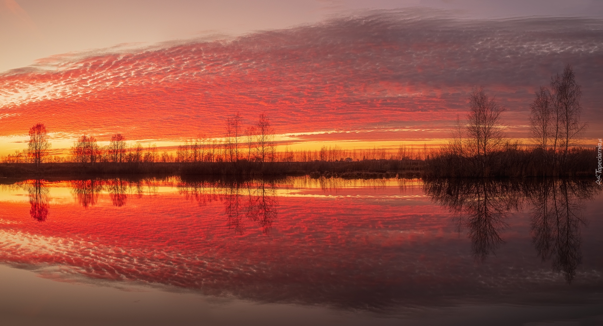 Edytor tapety: Kolorowe niebo nad rzeką i drzewami