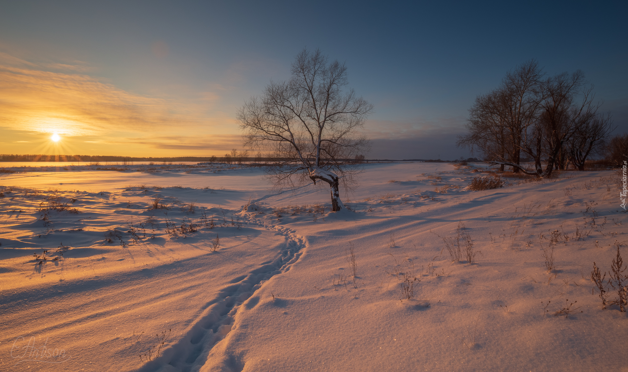 Edytor tapety: Krajobraz zimą o zachodzie słońca