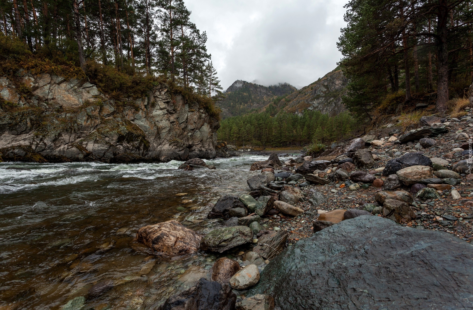 Edytor tapety: Kamienista rzeka płynąca obok skały w lesie