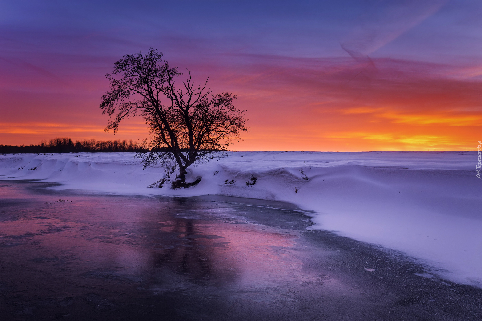 Edytor tapety: Drzewo nad zamarzniętym brzegiem rzeki