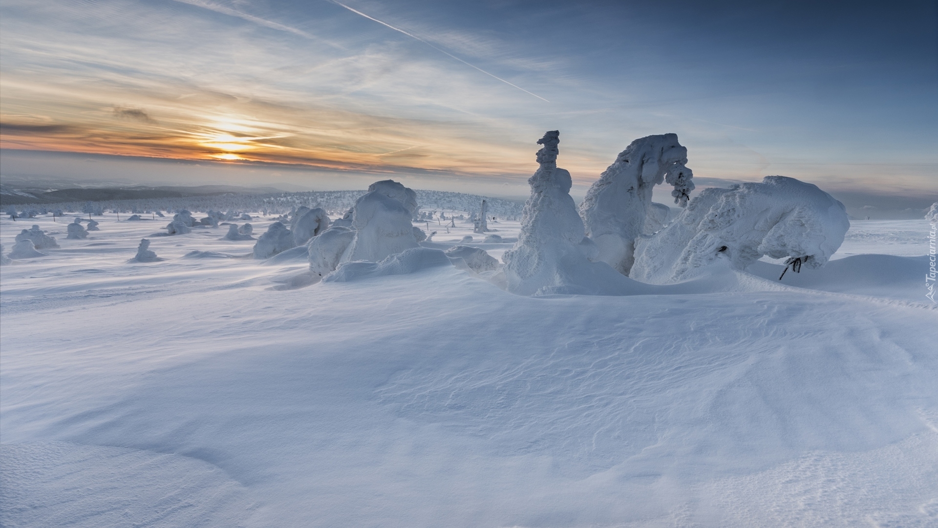 Edytor tapety: Ośnieżone drzewa na polu we wschodzącym słońcu