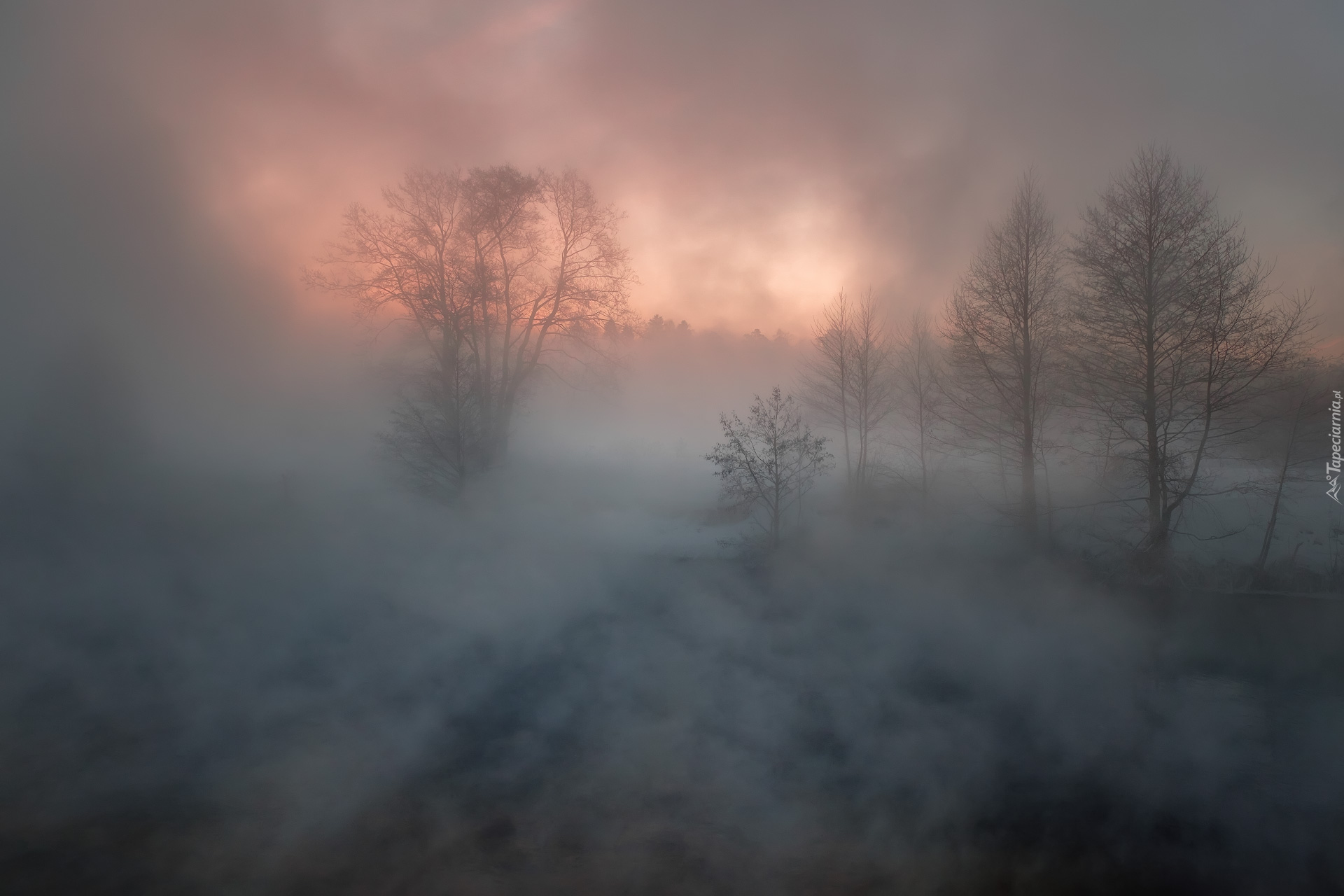 Edytor tapety: Drzewa we mgle o wschodzie słońca