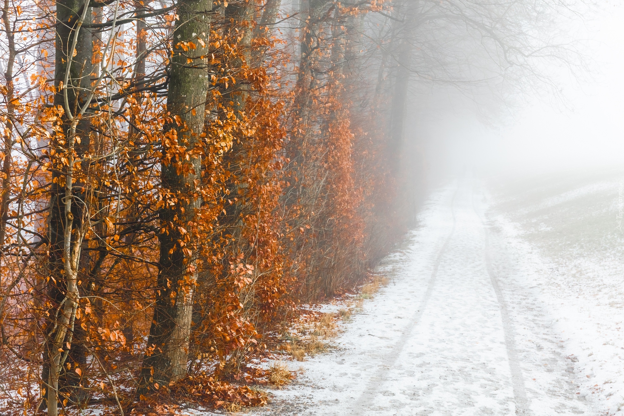 Edytor tapety: Pożółkłe liście na drzewach przy ośnieżonej drodze