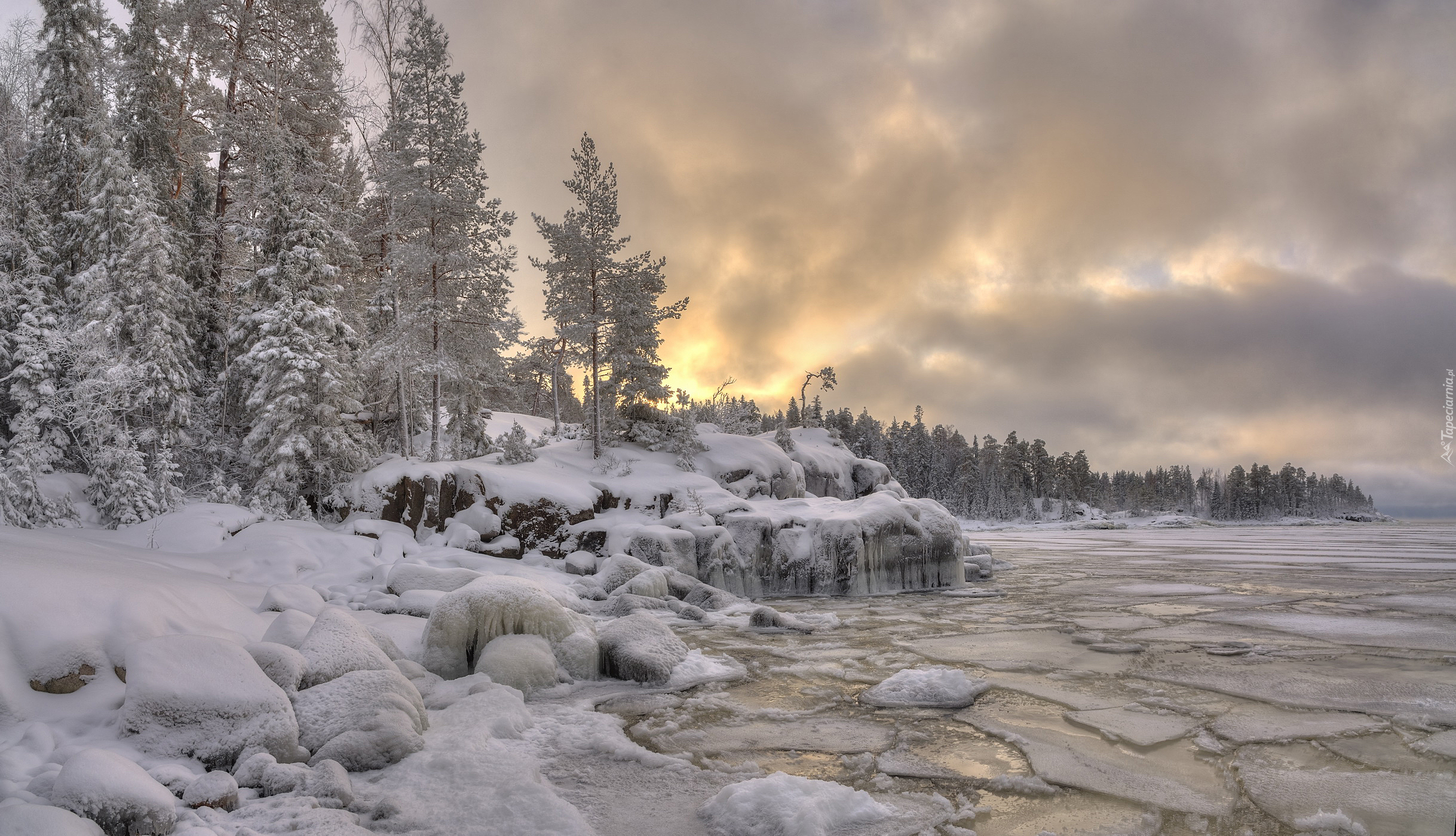 Edytor tapety: Las nad jeziorem w zimowej scenerii