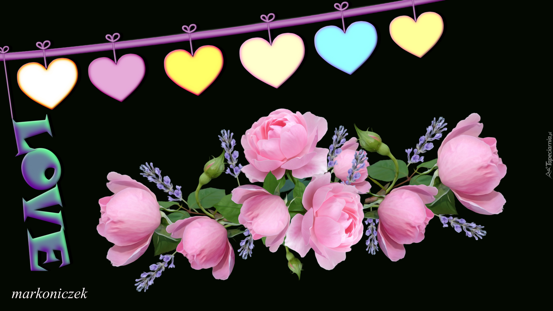 Edytor tapety: Serduszka i napis love obok bukietu róż