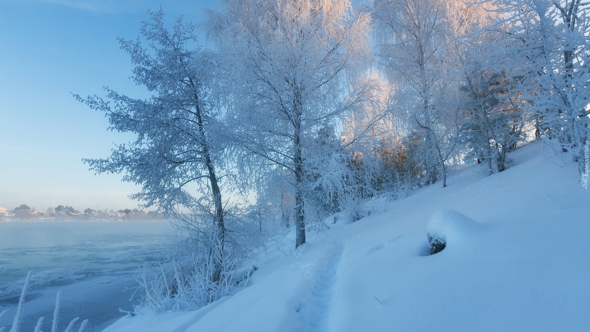 Edytor tapety: Ośnieżone drzewa nad rzeką Wołgą w Moskwie