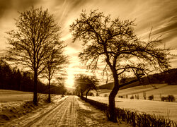 Edytor tapety: Drzewa wzdłuż drogi oświetlonej słońcem