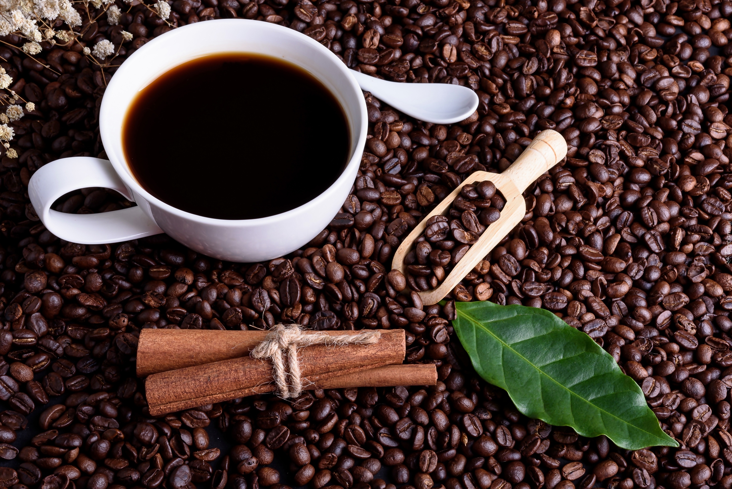 Edytor tapety: Filiżanka kawy na ziarnach obok cynamonu i łopatki