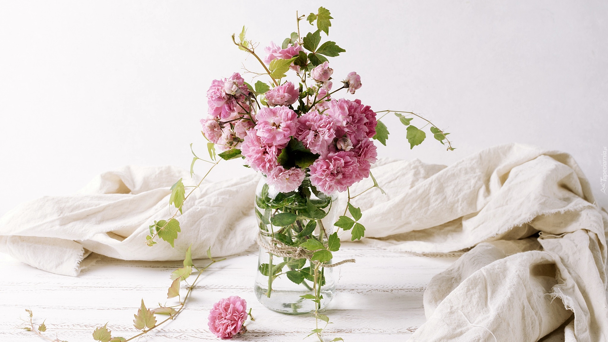 Edytor tapety: Różowe kwiaty w szklanym wazoniku