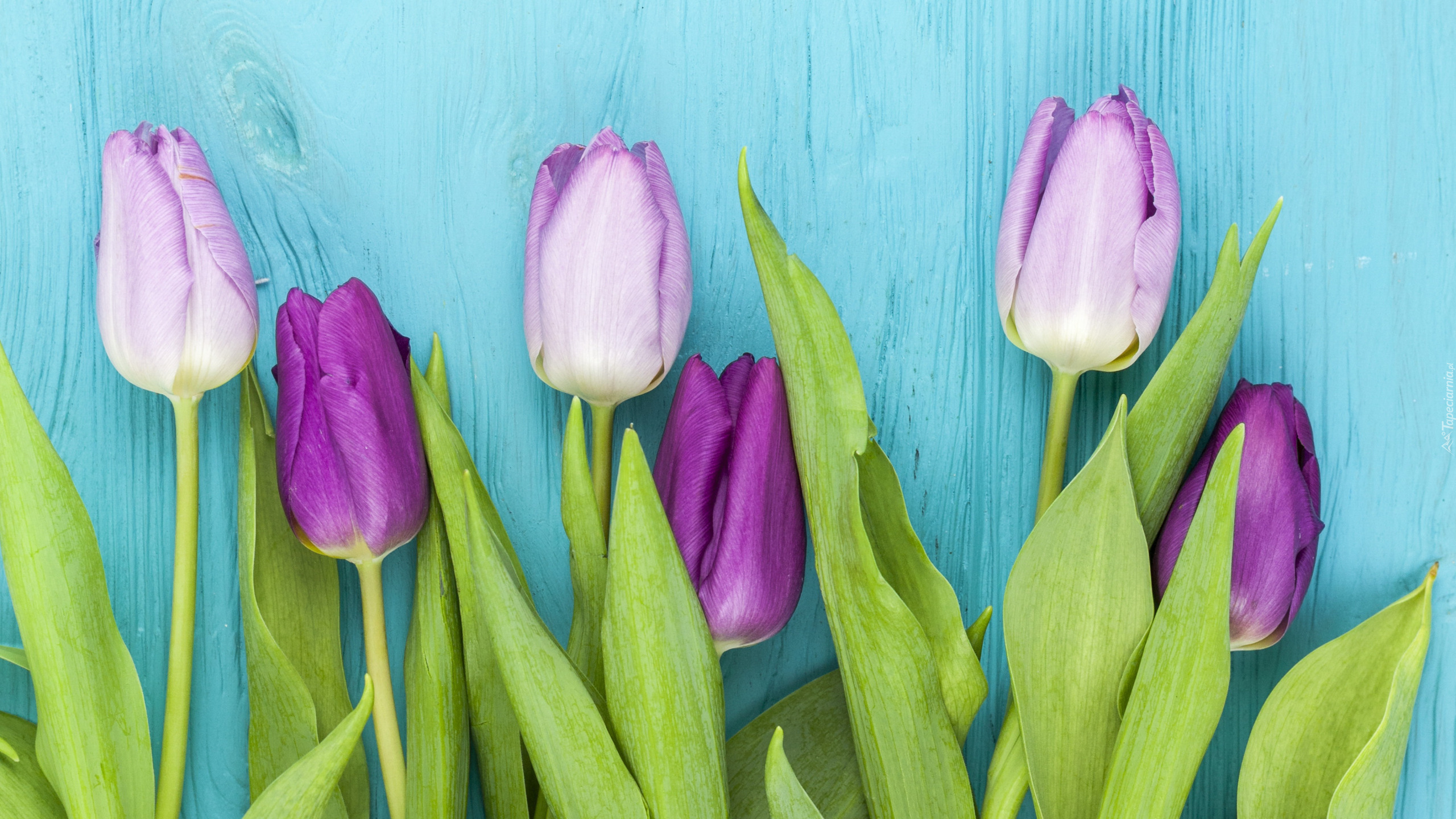 Edytor tapety: Tulipany na niebieskich deskach