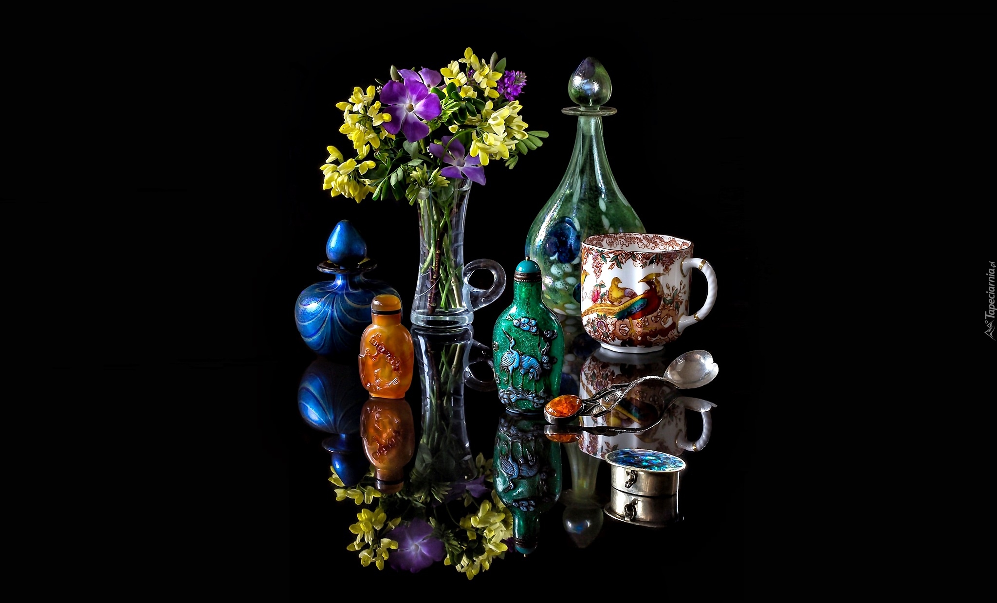 Edytor tapety: Wazon z kwiatami obok karafki i kubka