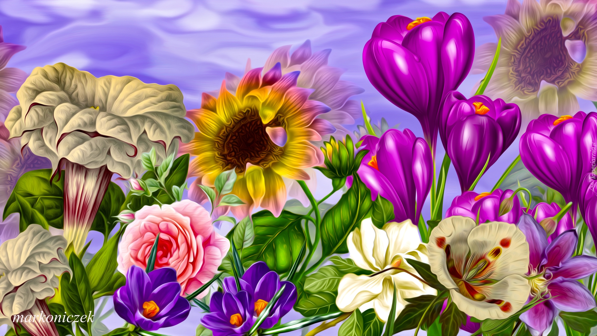 Edytor tapety: Krokusy i inne kolorowe kwiaty w grafice